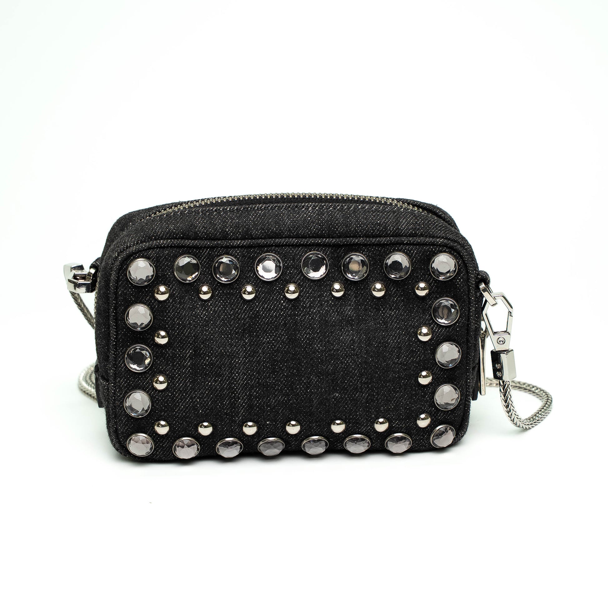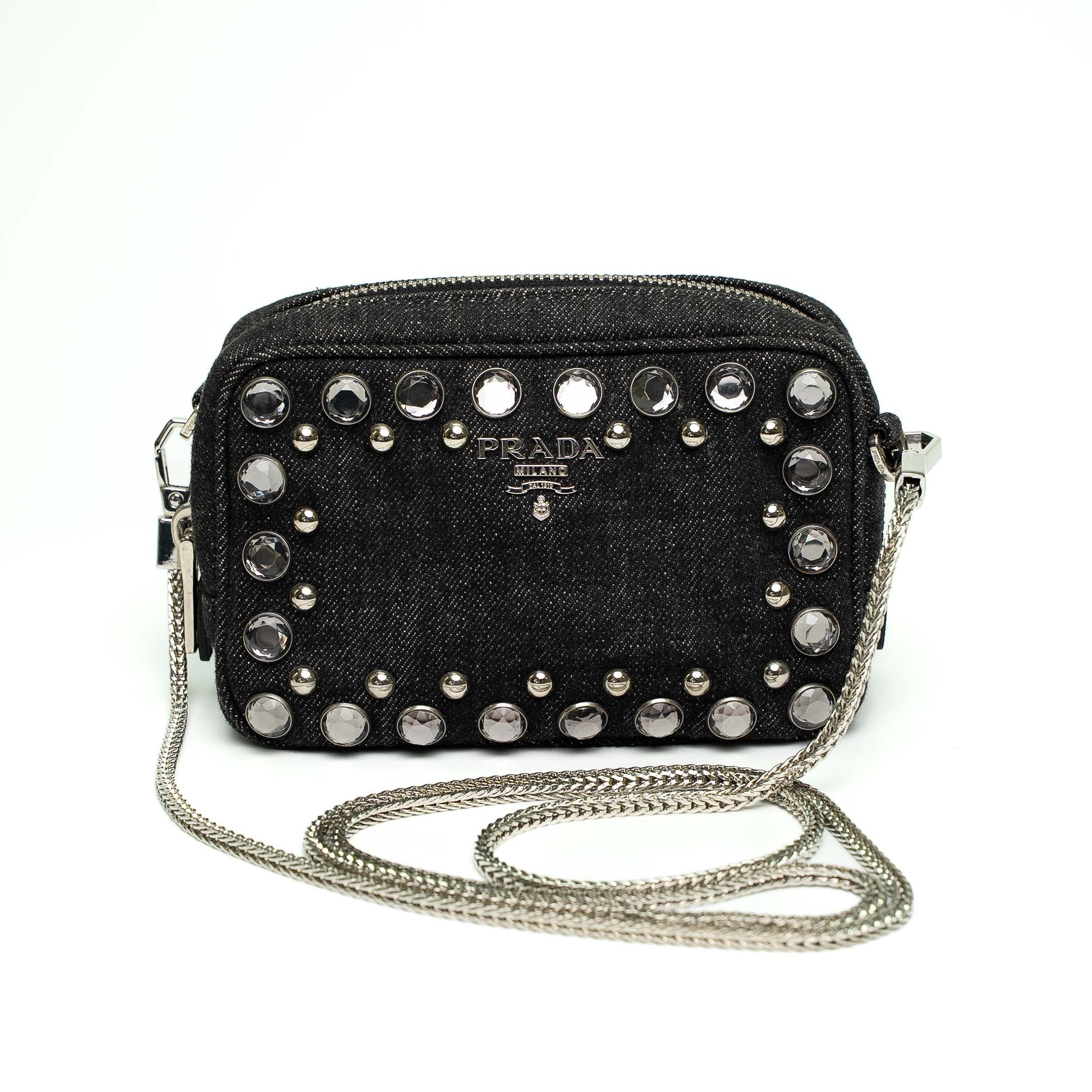 Edgy yet refined, crafted in black denim with silver stud embellishments and a sleek chain strap — a bold compact statement piece from Prada.