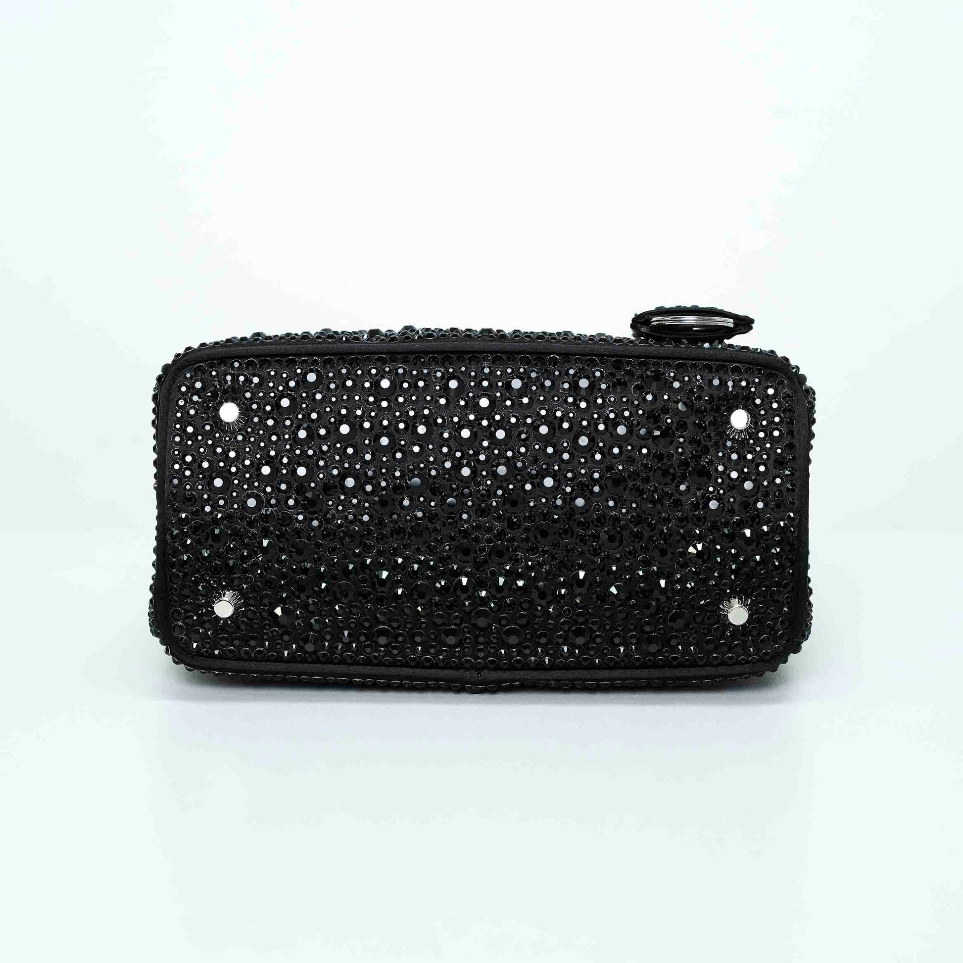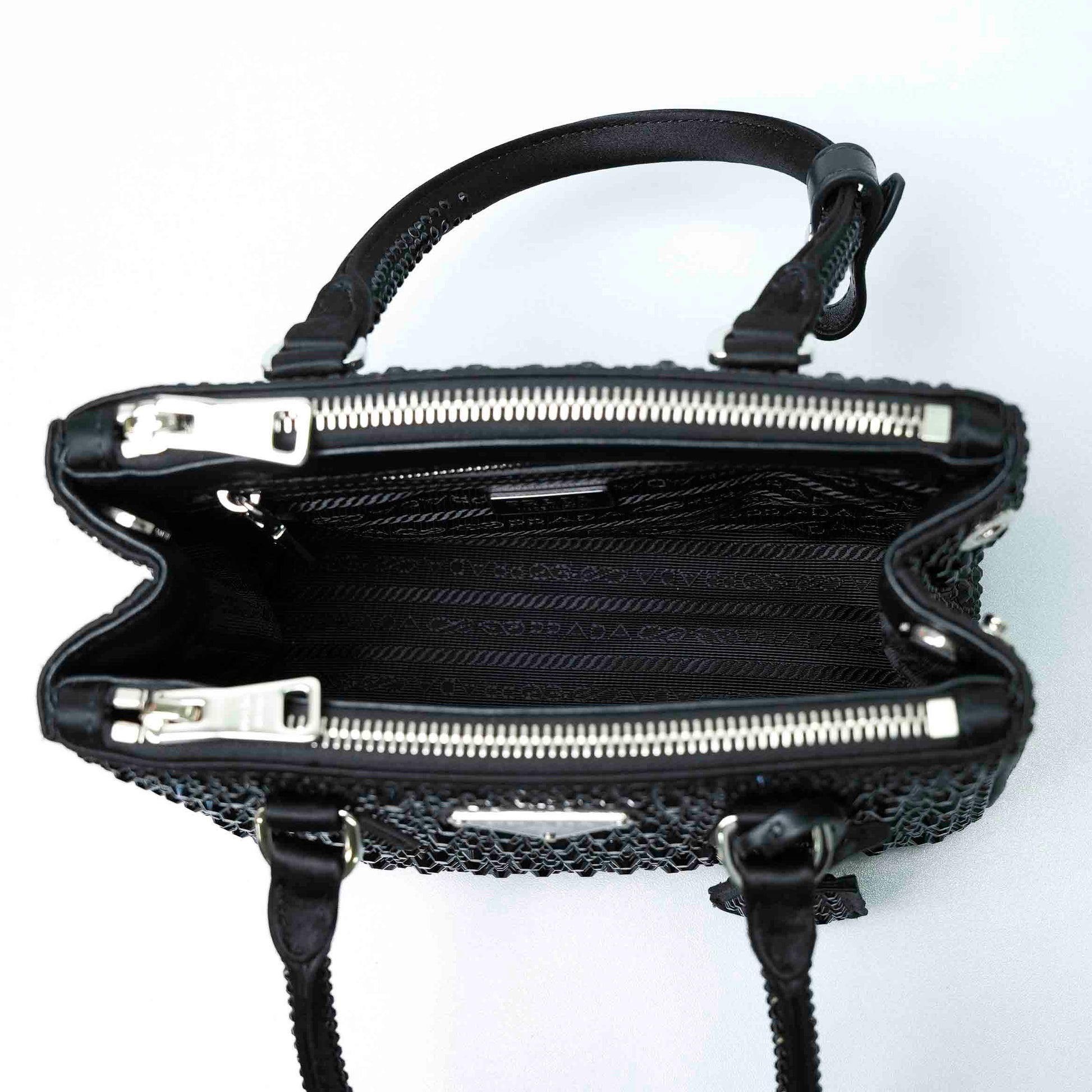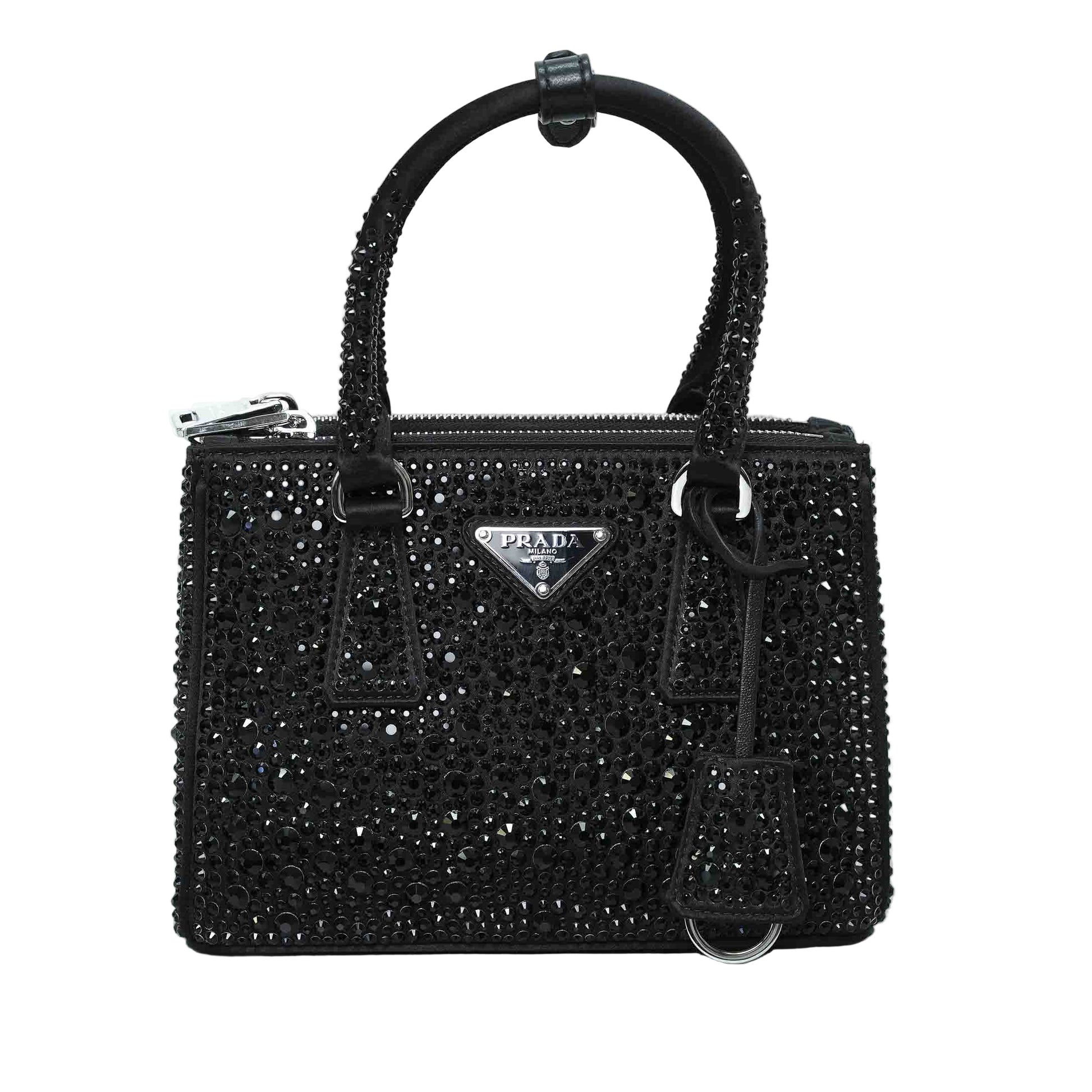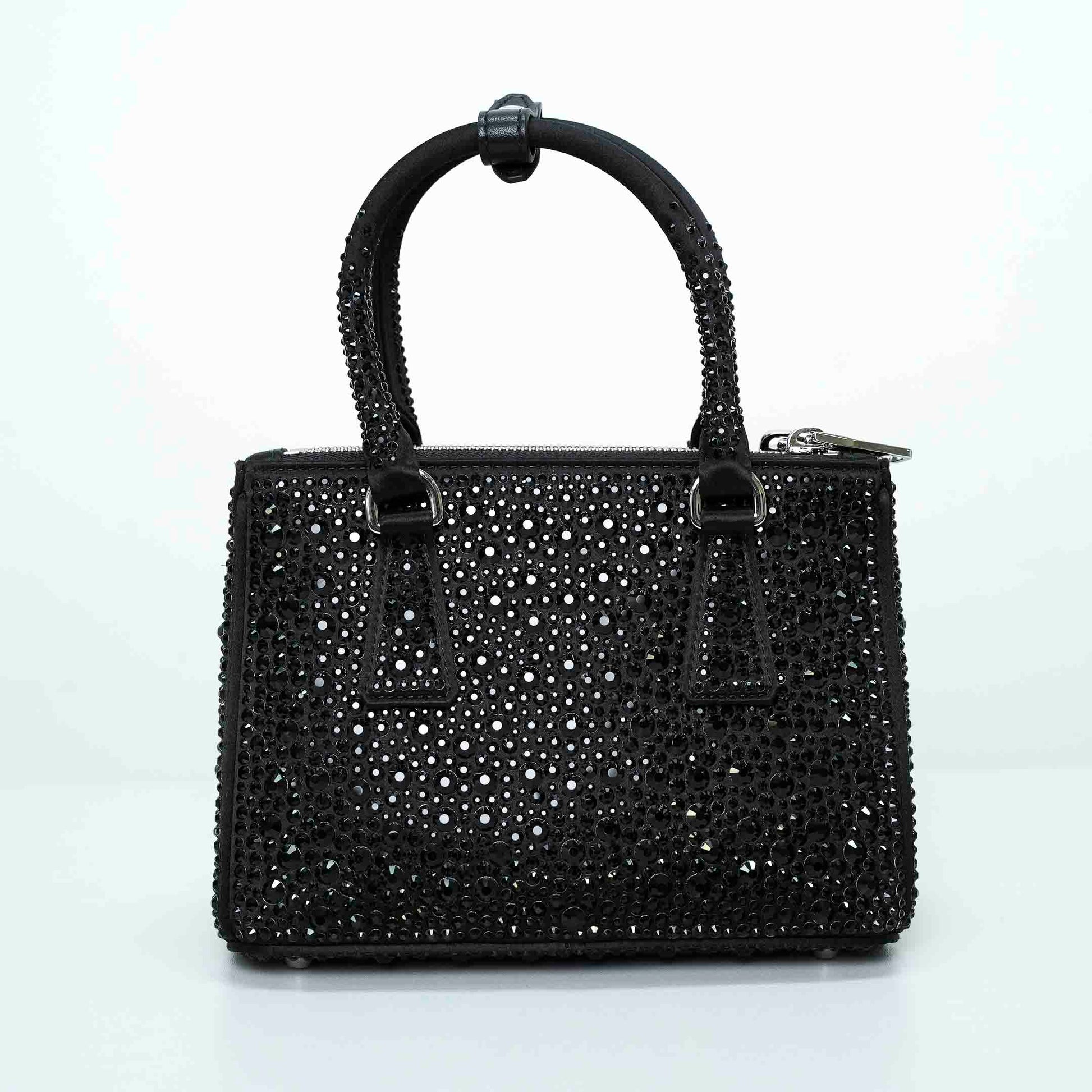 This Prada Galleria Mini Bag in Black Silk with crystal embellishments is a dazzling showcase of the maison’s elegance and craftsmanship. Featuring dual rolled leather handles, silver-tone hardware, and the iconic enamel triangle logo, it’s a statement piece designed for both sophistication and glamour. Compact yet structured, it offers ample organization with two zipped compartments and a central open section.