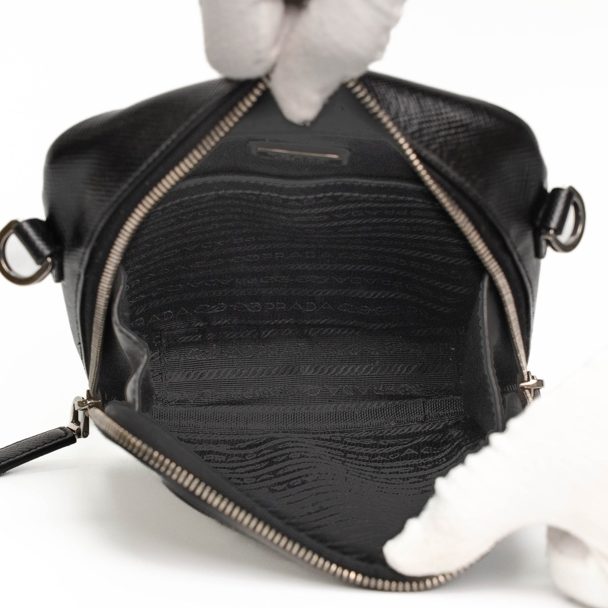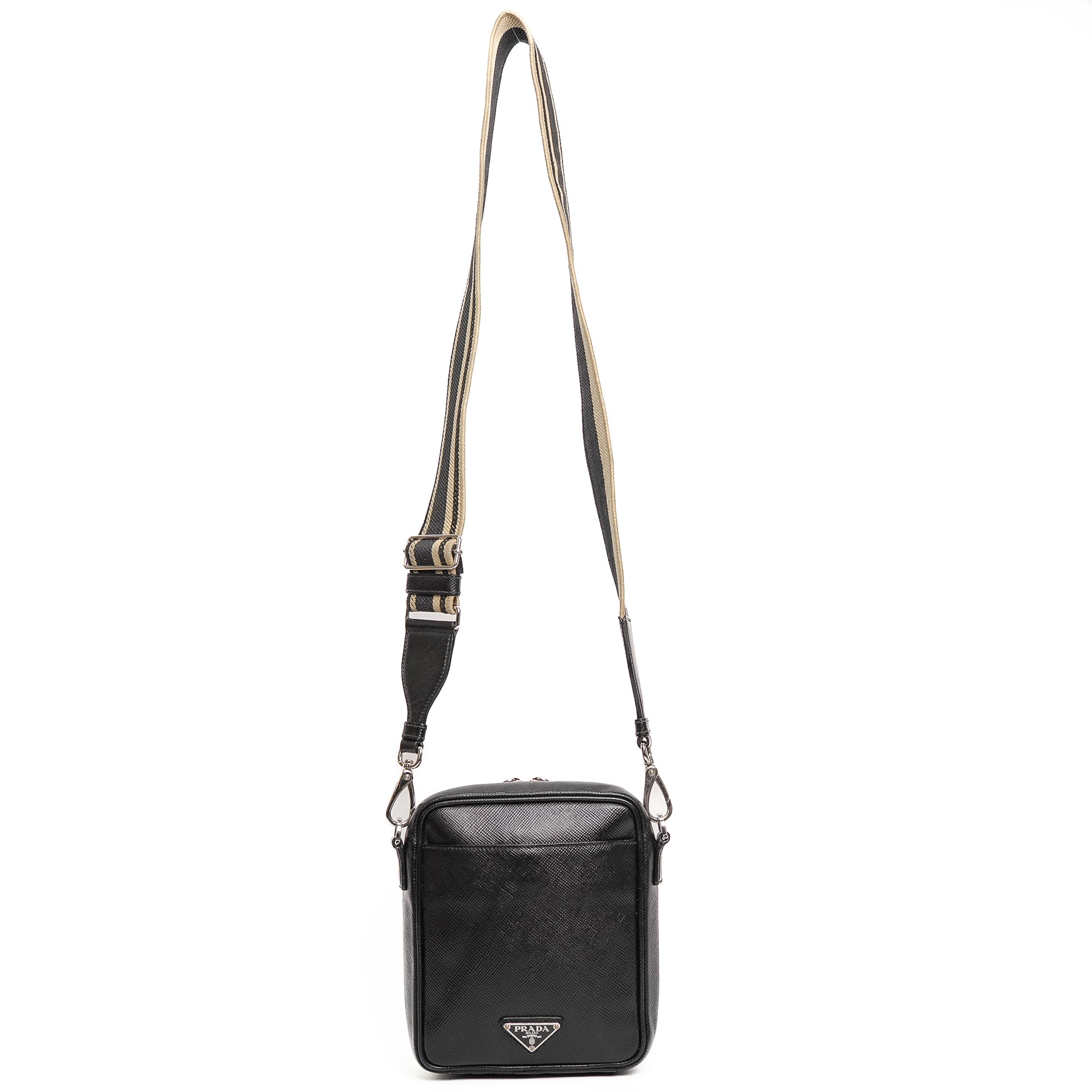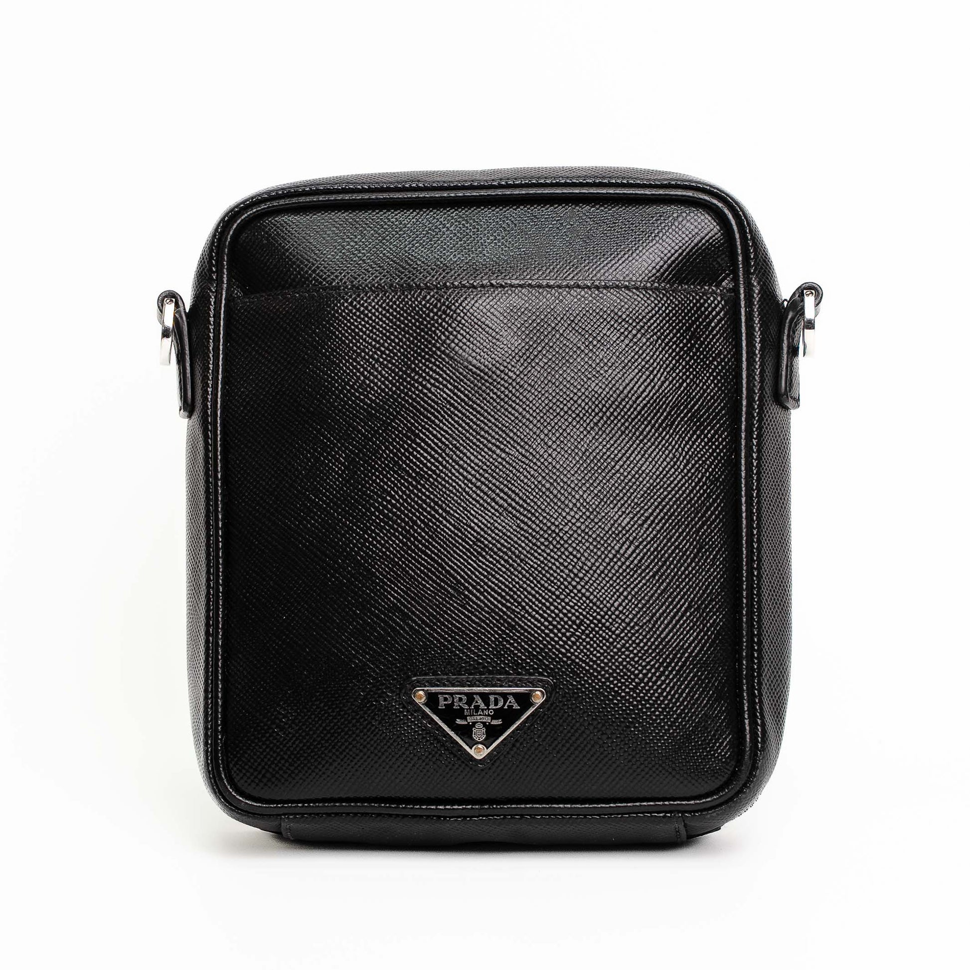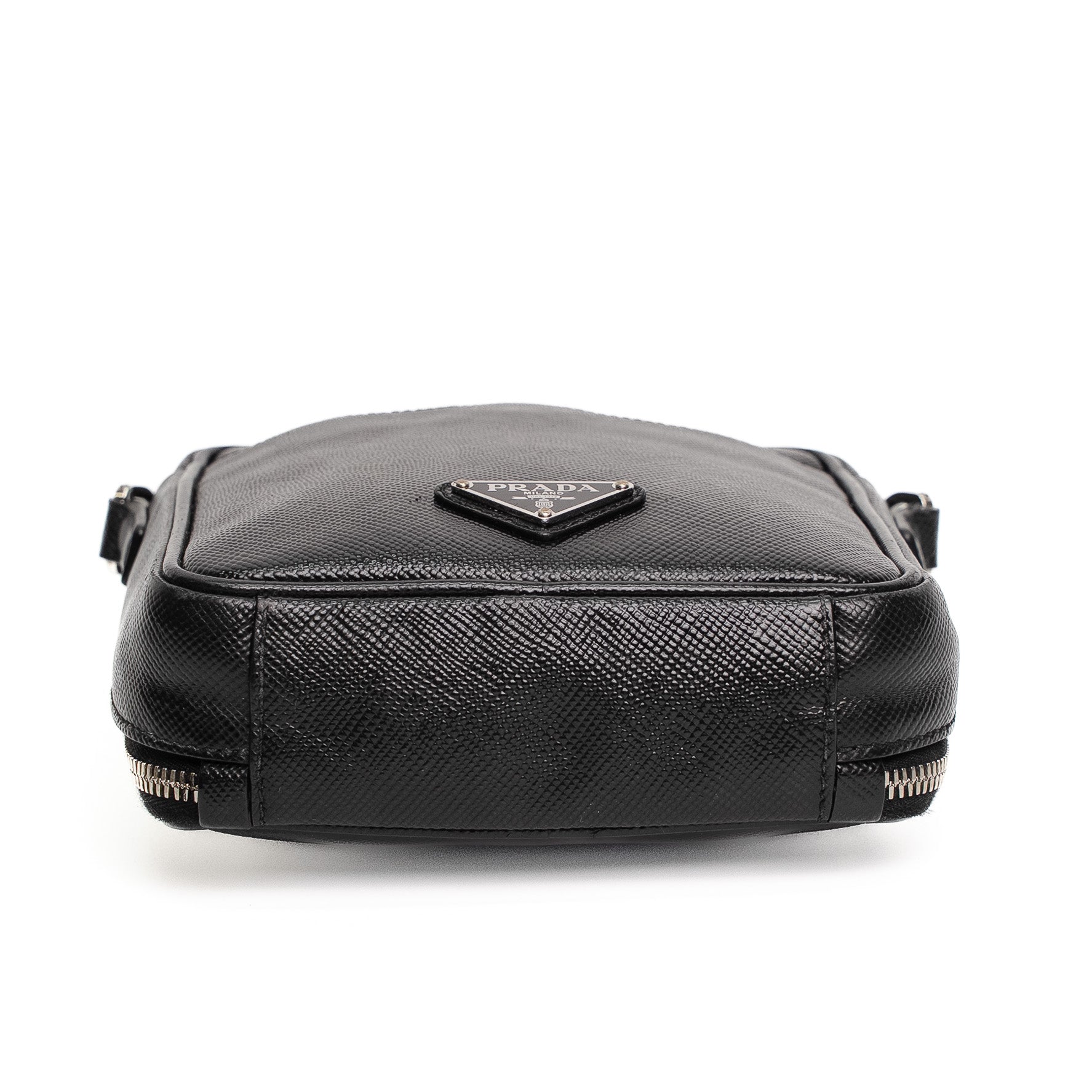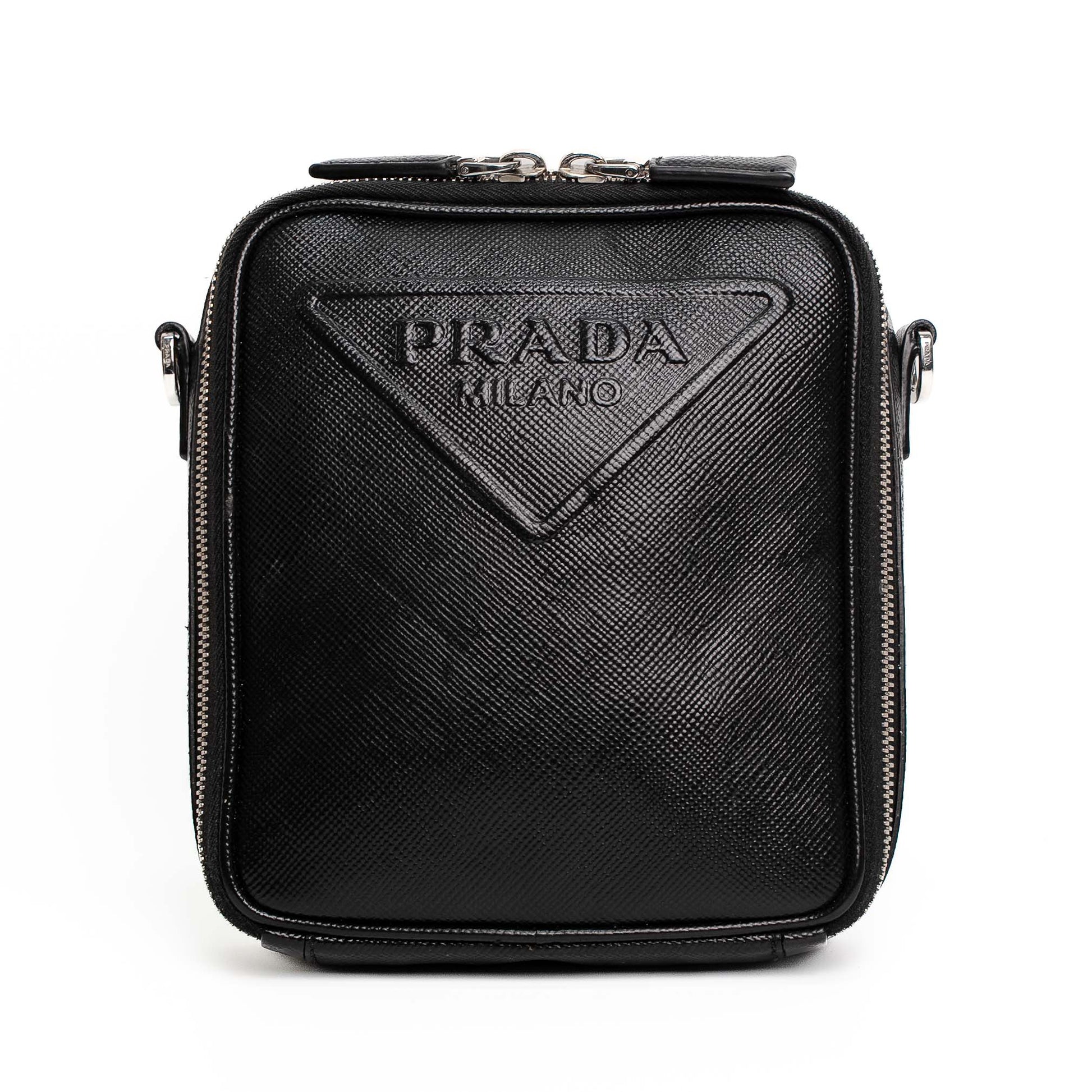 A sleek Prada crossbody bag crafted in black Saffiano leather with iconic triangular logo and dual-zip design.