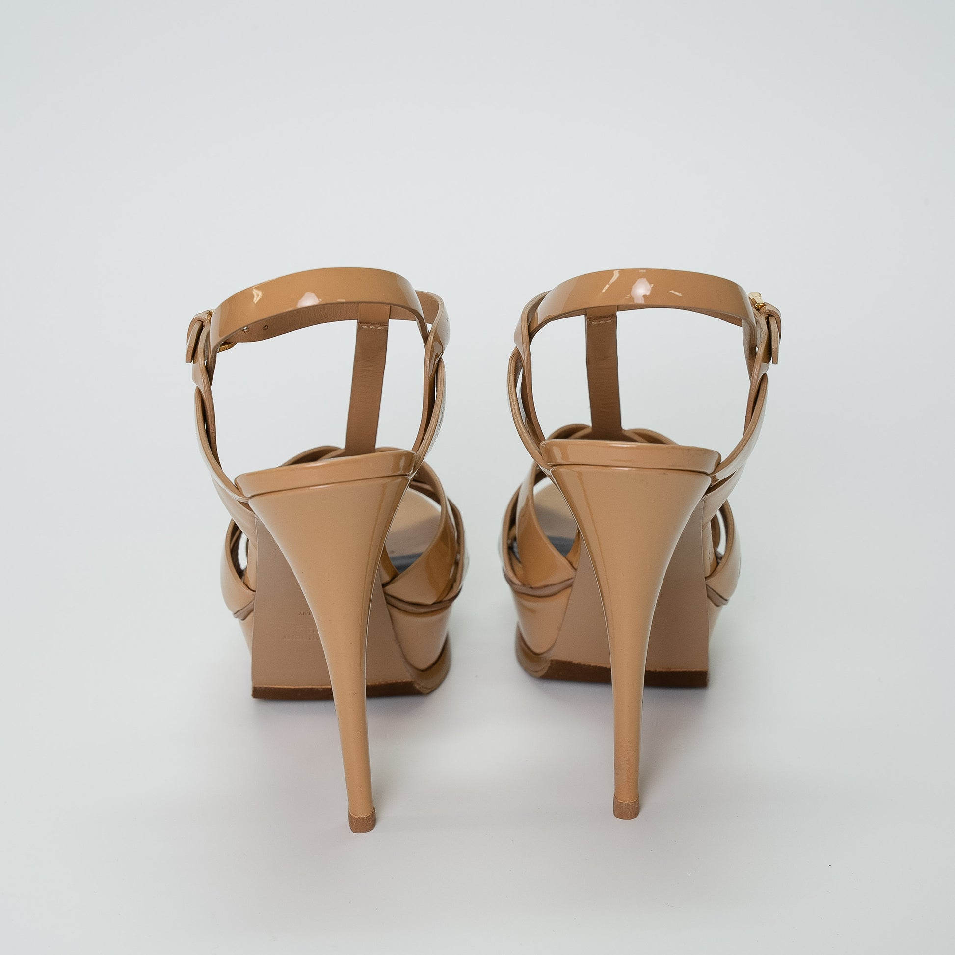Saint Laurent Tribute Platform Sandals in Dark Beige Patent Leather
