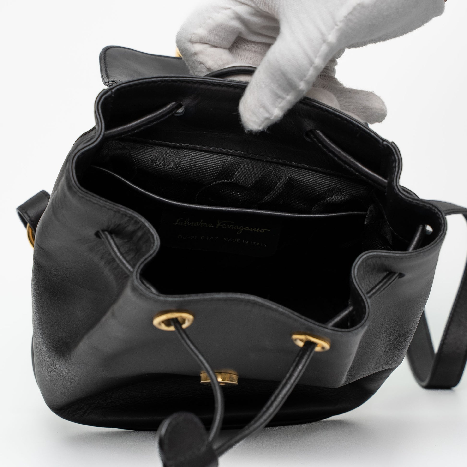 - Branding: Gancini hardware with Ferragamo logo; interior stamp
