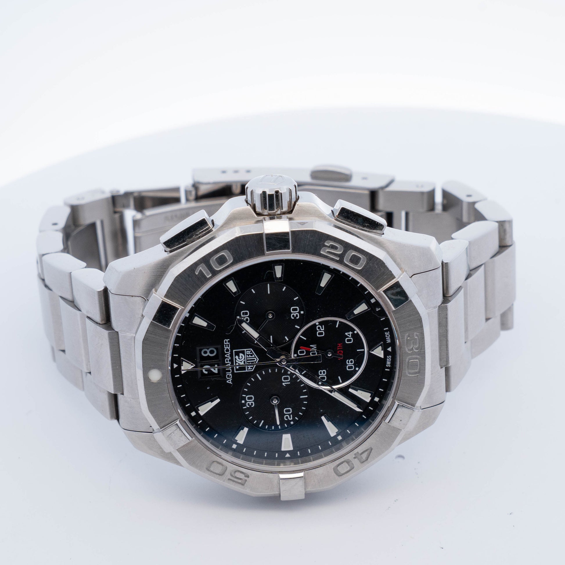 The TAG Heuer Aquaracer Chronograph delivers robust dive functionality with bold styling, featuring a black chronograph dial, unidirectional rotating bezel, and 300m water resistance. A versatile luxury sports watch built for both professional divers and everyday wear.
