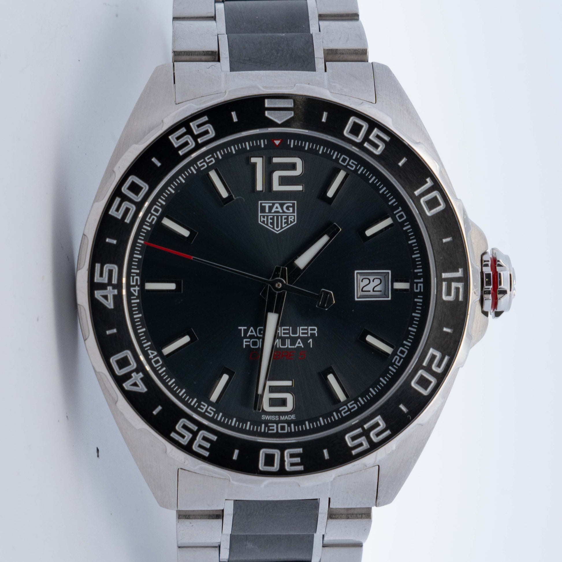 TAG Heuer Formula 1 sports watch featuring a black sunburst dial, ceramic bezel, and 200m water resistance. Built for precision and durability.