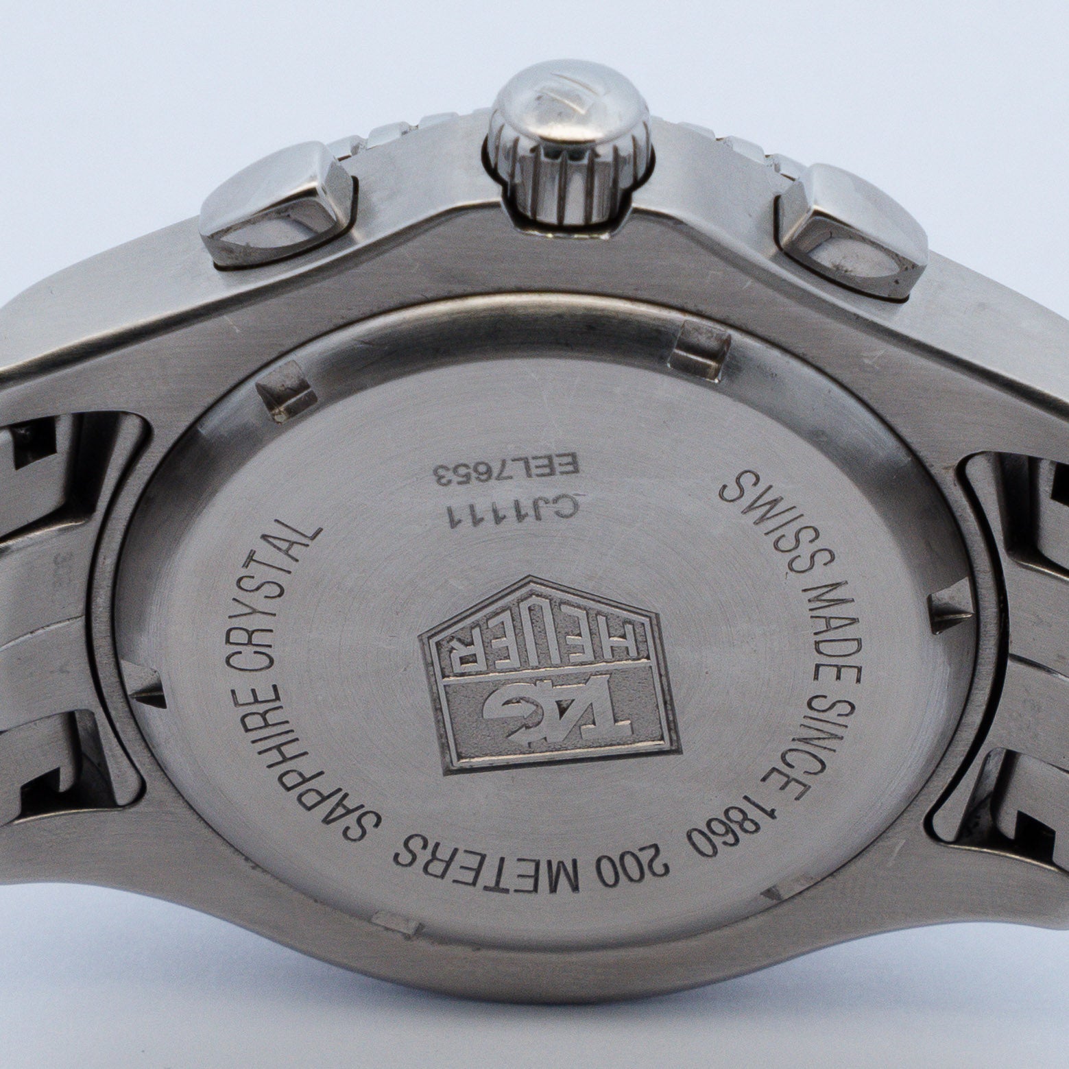 TAG Heuer Link Chronograph CJ1111 with 40 mm steel case, silver dial, three sub-dials, date at 4:30, rotating bezel, and signature S-link bracelet with sapphire crystal durability.