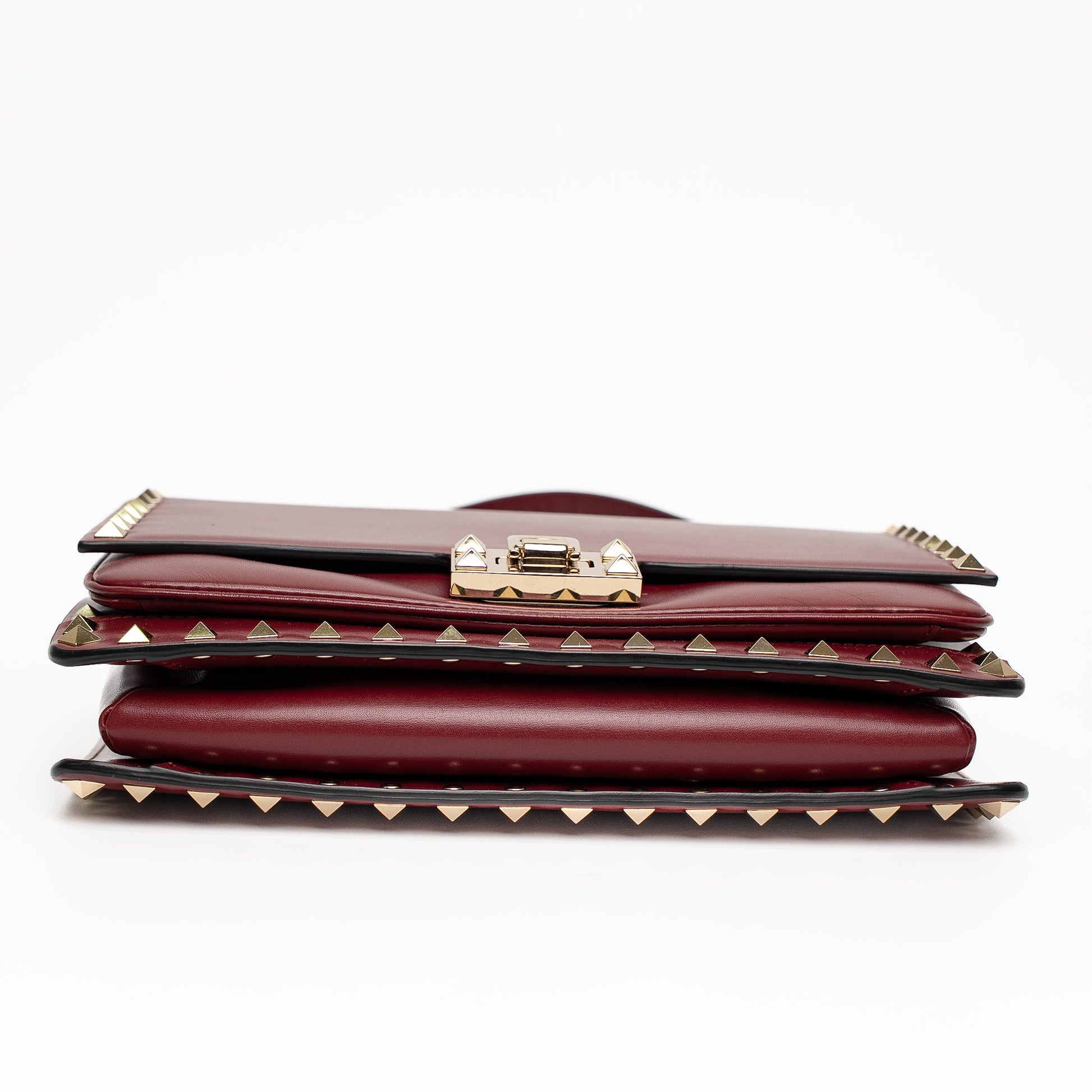 Bold Valentino Garavani Rockstud shoulder bag in rich burgundy leather with gold-tone hardware.