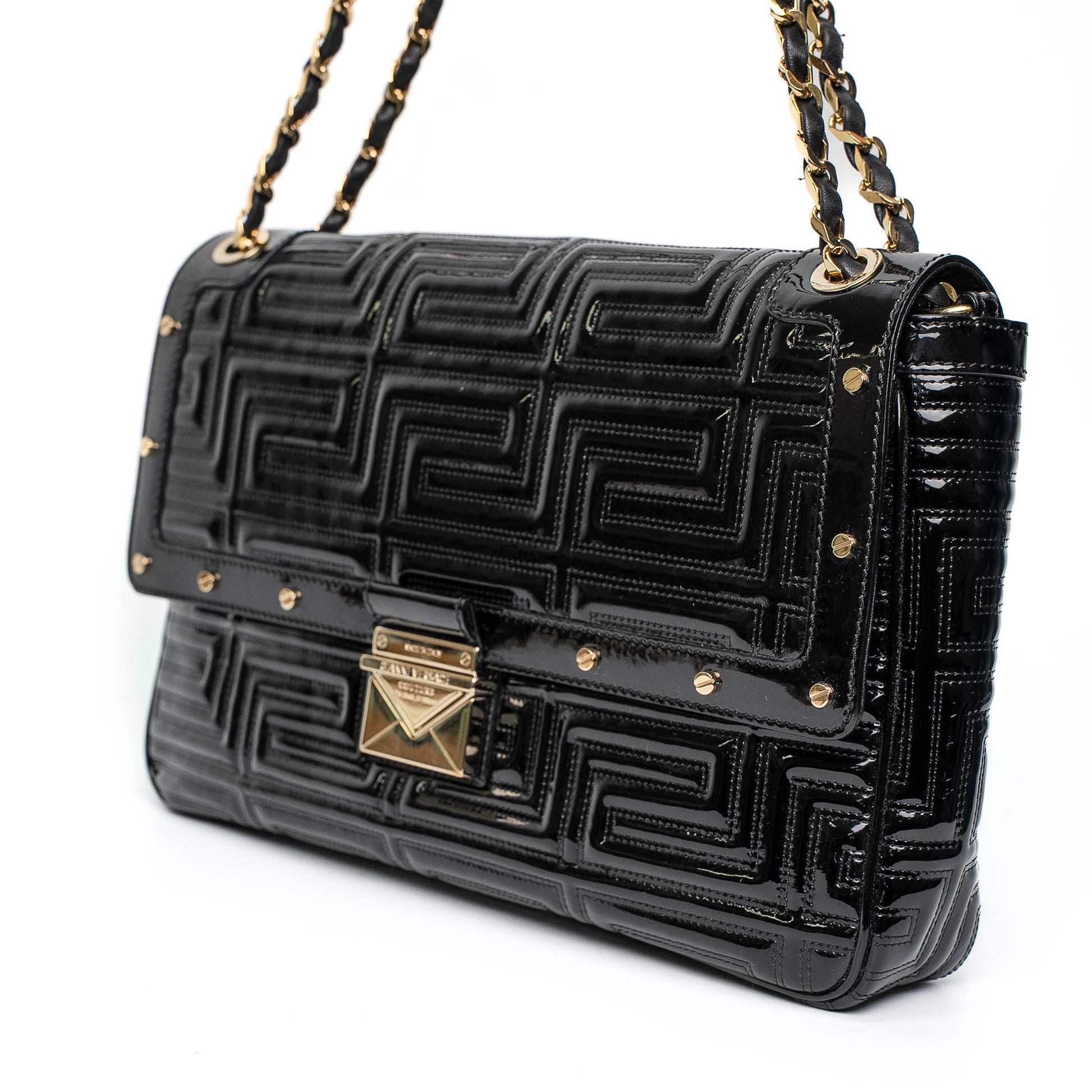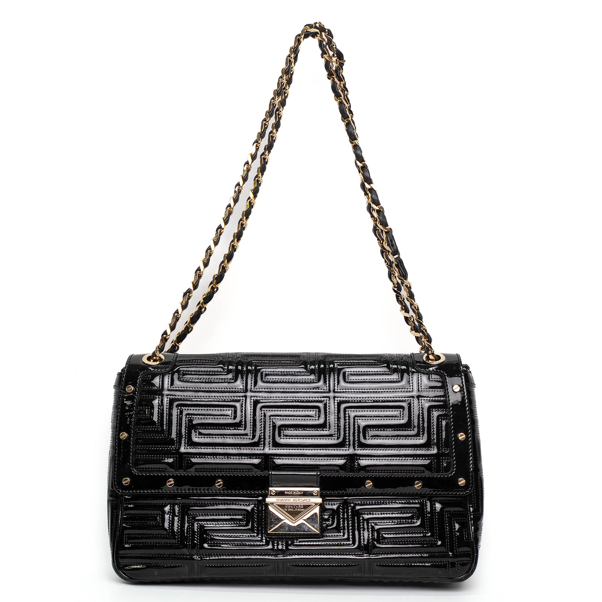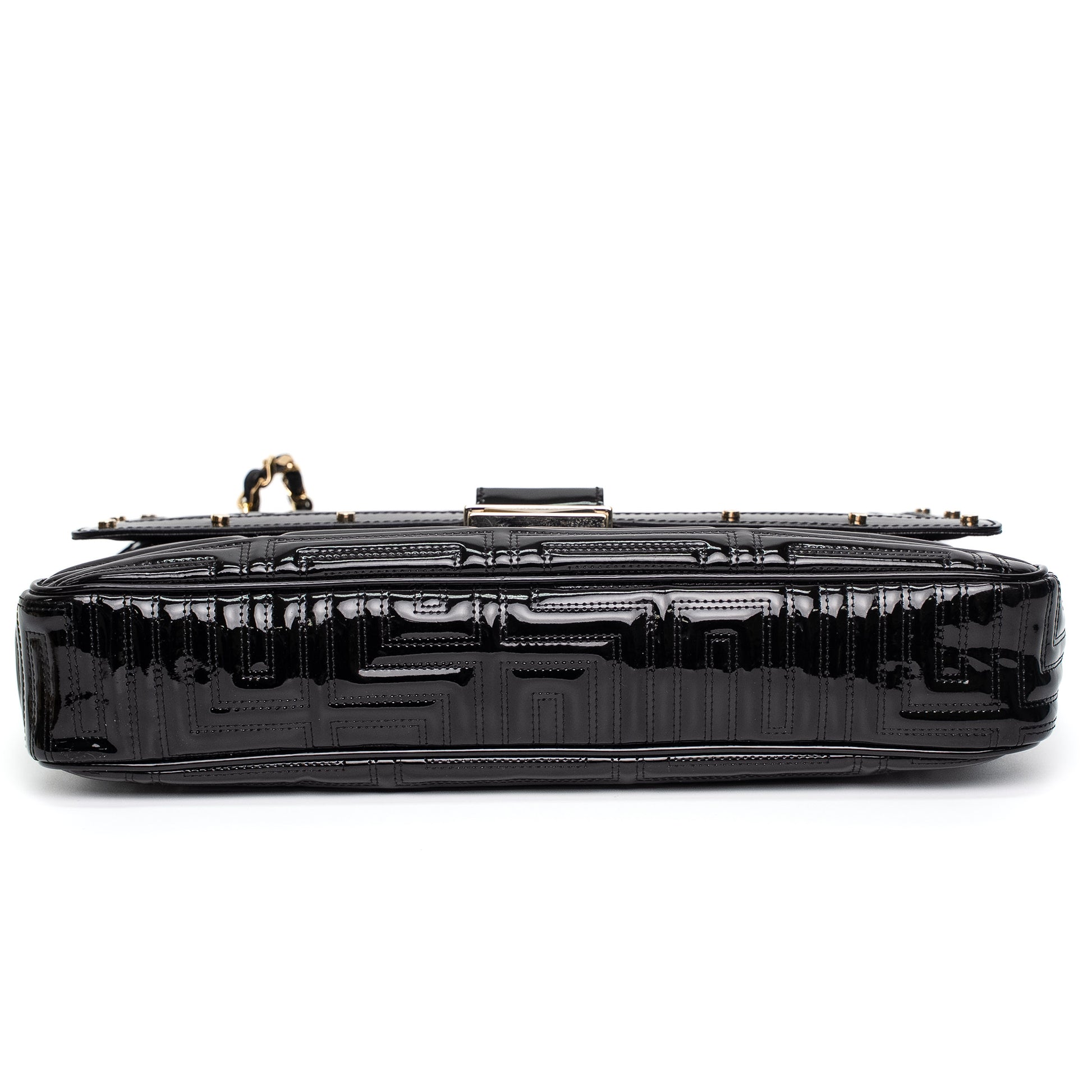 A bold Versace shoulder bag crafted in glossy black patent leather with signature quilted detailing and striking gold-tone hardware.