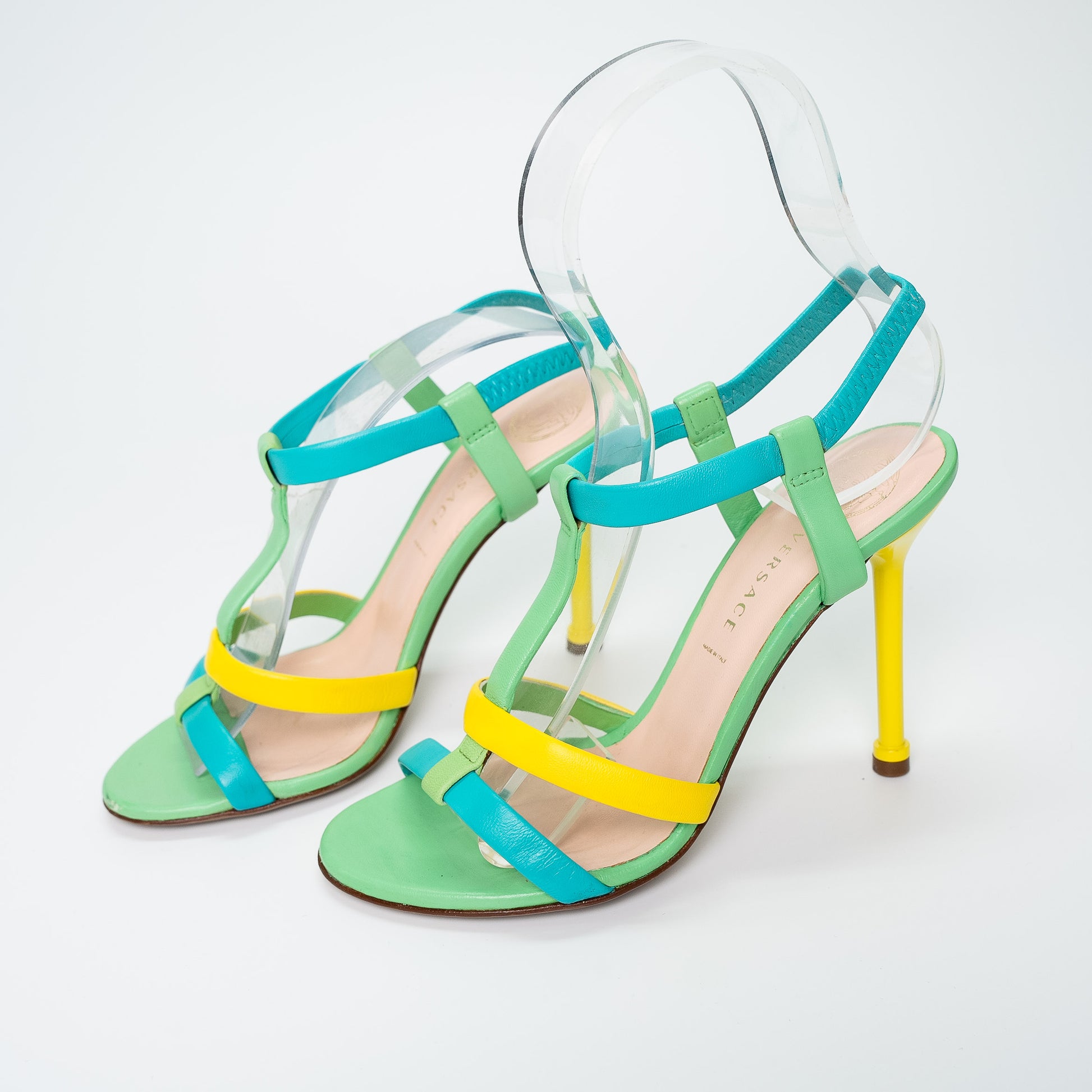 Versace tri-colour (green, yellow, turquoise) leather strappy sandals.