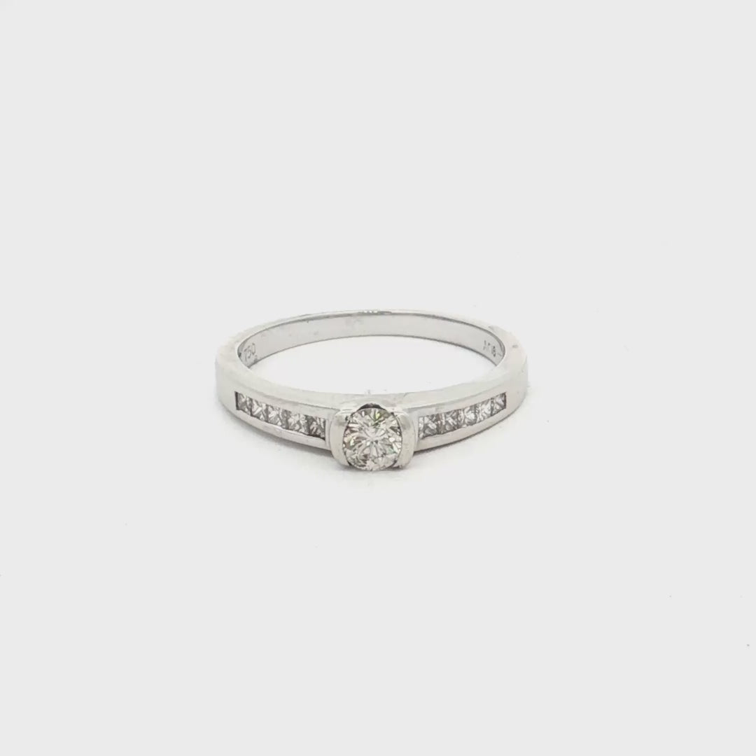 Sophisticated 18ct white gold ring featuring a brilliant-cut centre diamond with princess-cut side stones in a seamless rub-over and channel setting.