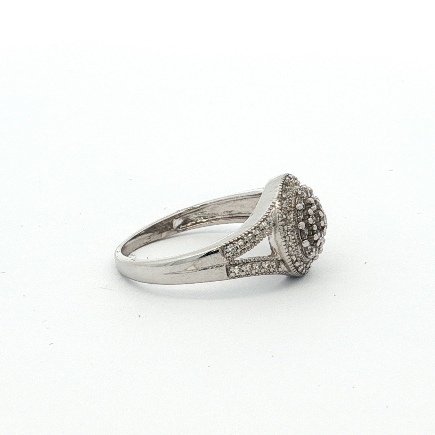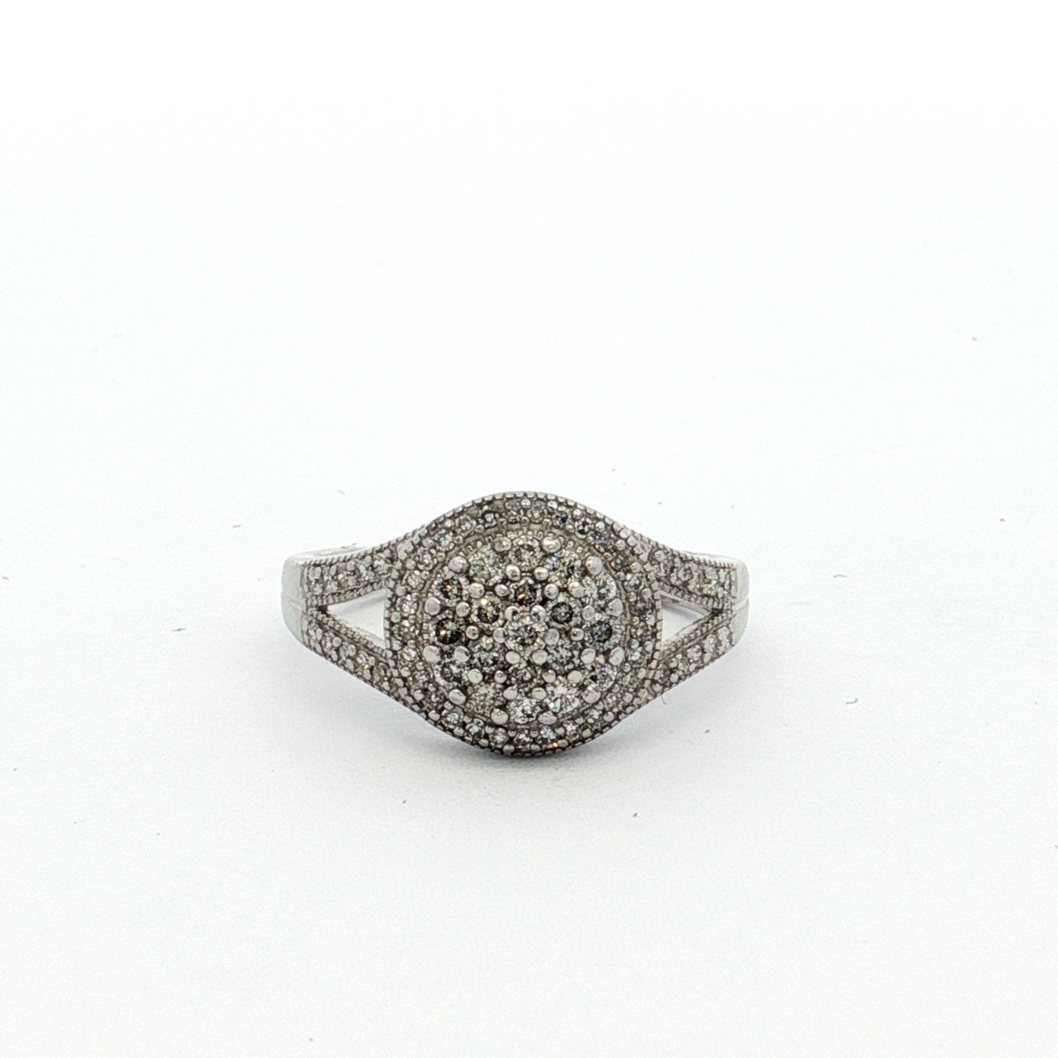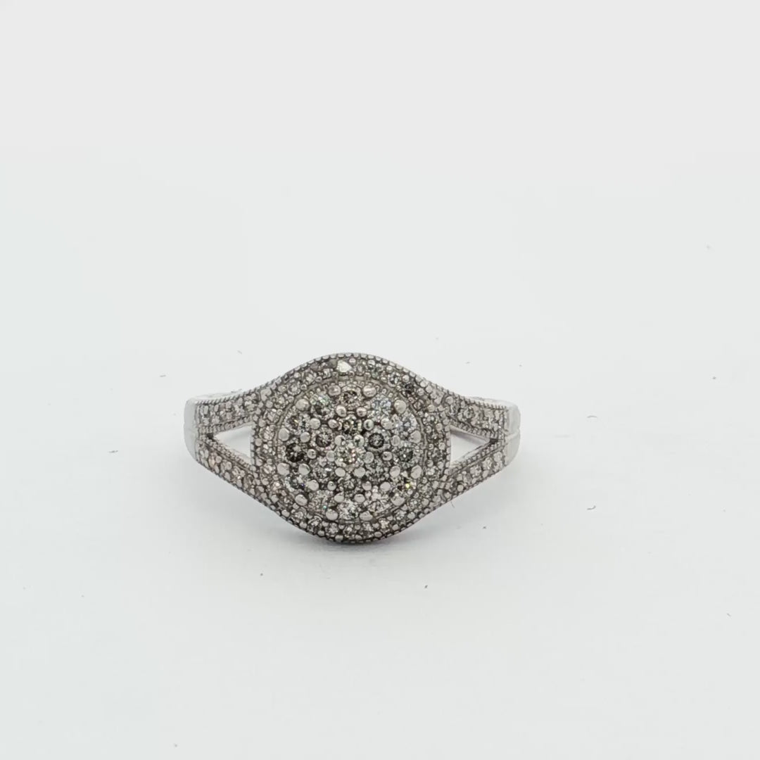 10k white gold cluster ring with 68 diamonds, featuring a central round brilliant cut, halo of single cuts, and split-shoulder accents for added sparkle.