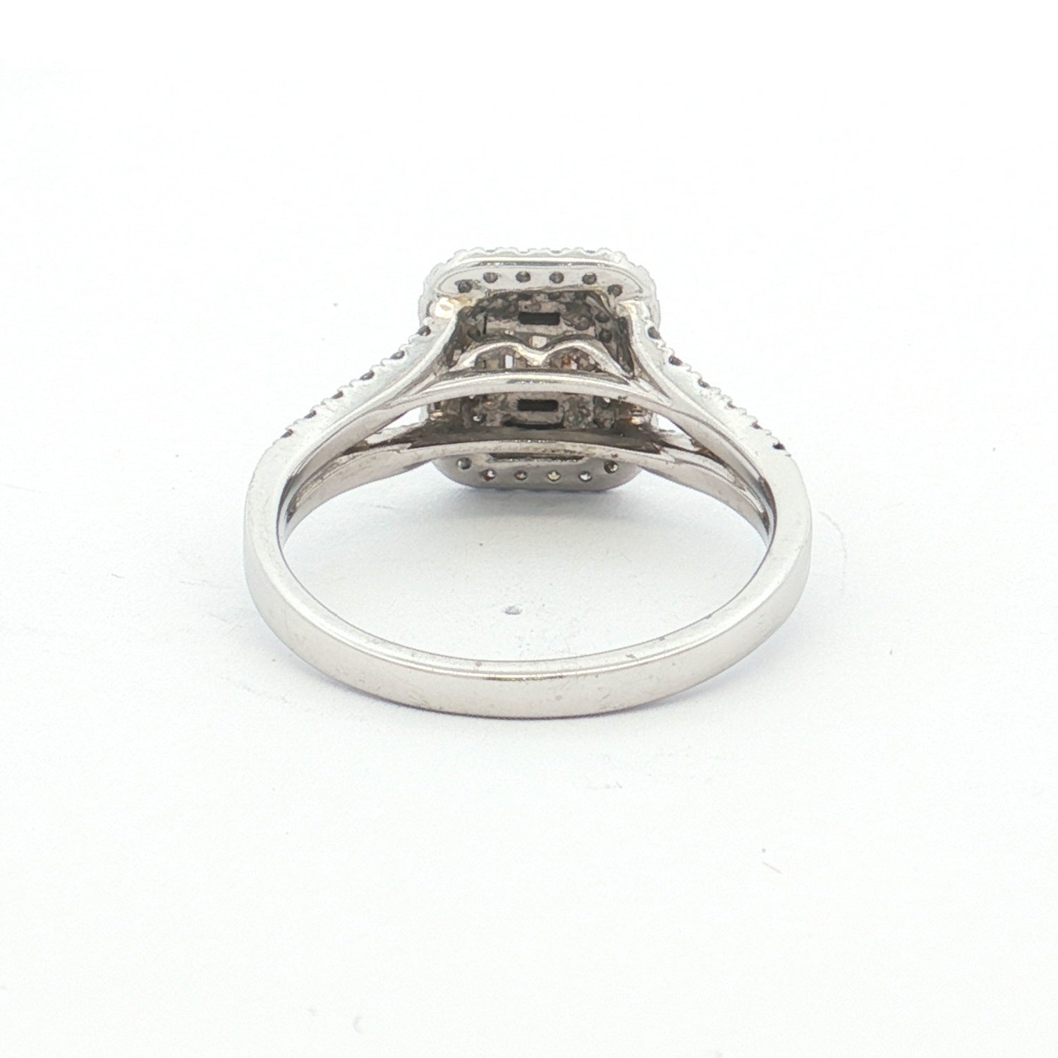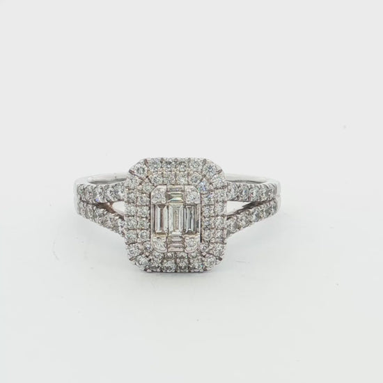A striking 9ct white gold 77-stone diamond cluster ring featuring a baguette and round brilliant cut rectangular cluster, surrounded by additional round diamonds and accented shoulders. A bold and sparkling design.