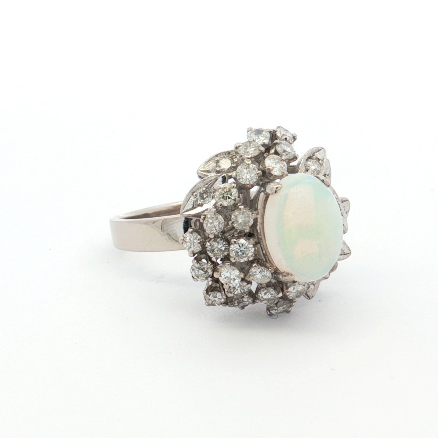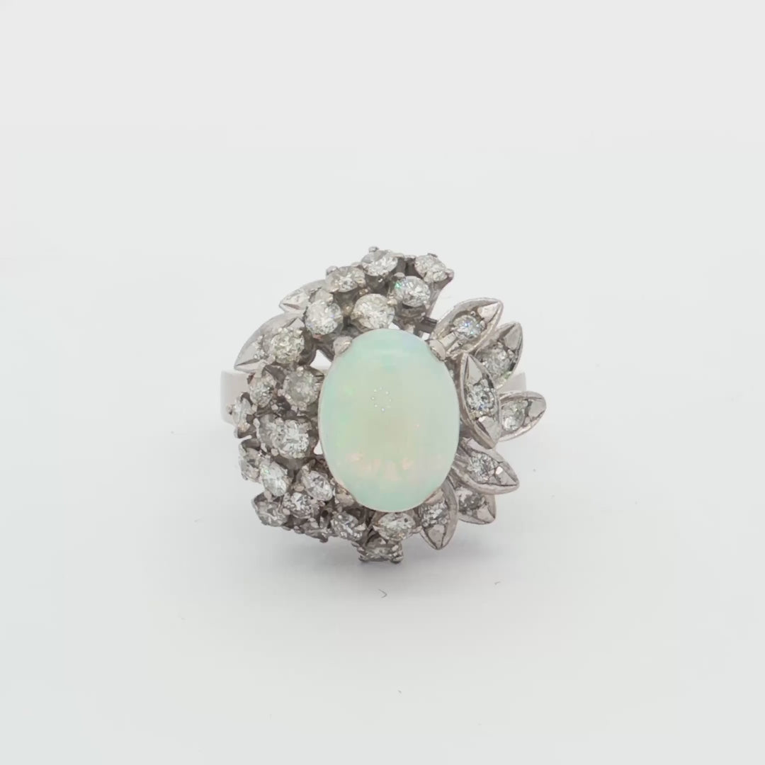 A striking 18ct white gold ring featuring an oval cabochon crystal opal with flashes of green and yellow, surrounded by three tiers of sparkling diamonds in a bold cluster design.