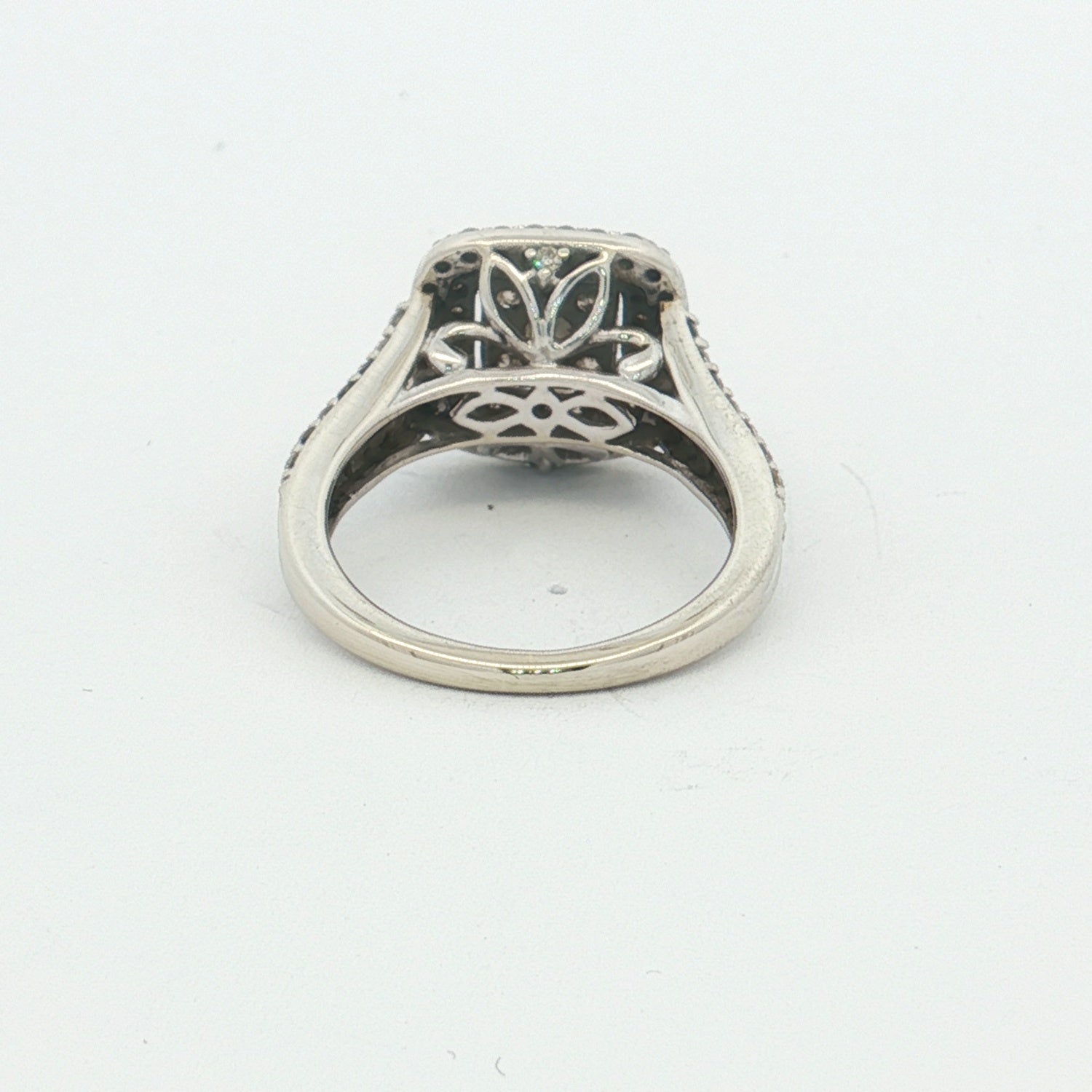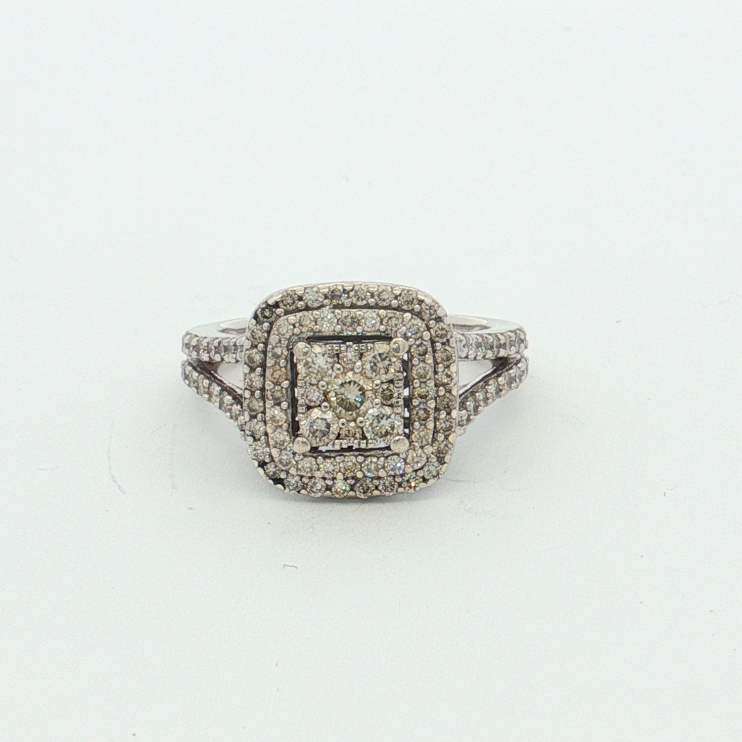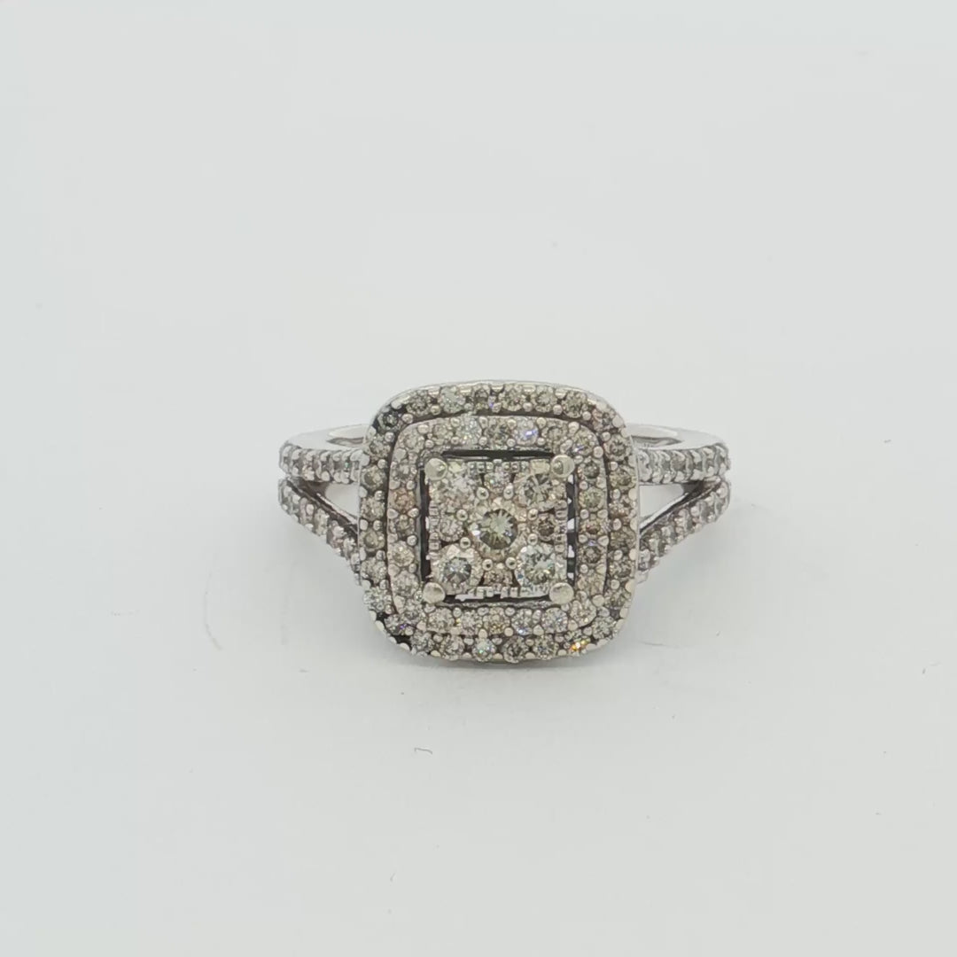 A stunning 9ct white gold diamond cluster ring featuring a 1.00 ct centre stone, surrounded by 91 sparkling round brilliant-cut diamonds. Elegant and timeless.