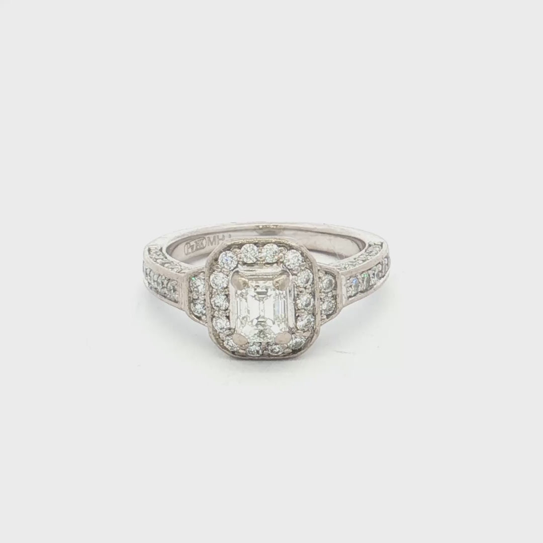 • Setting Style: Four-claw emerald-cut centre with halo, shoulder and band-set diamonds