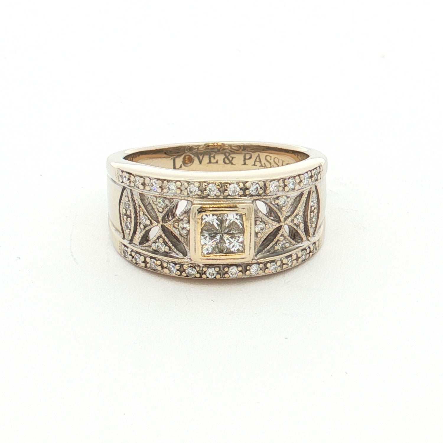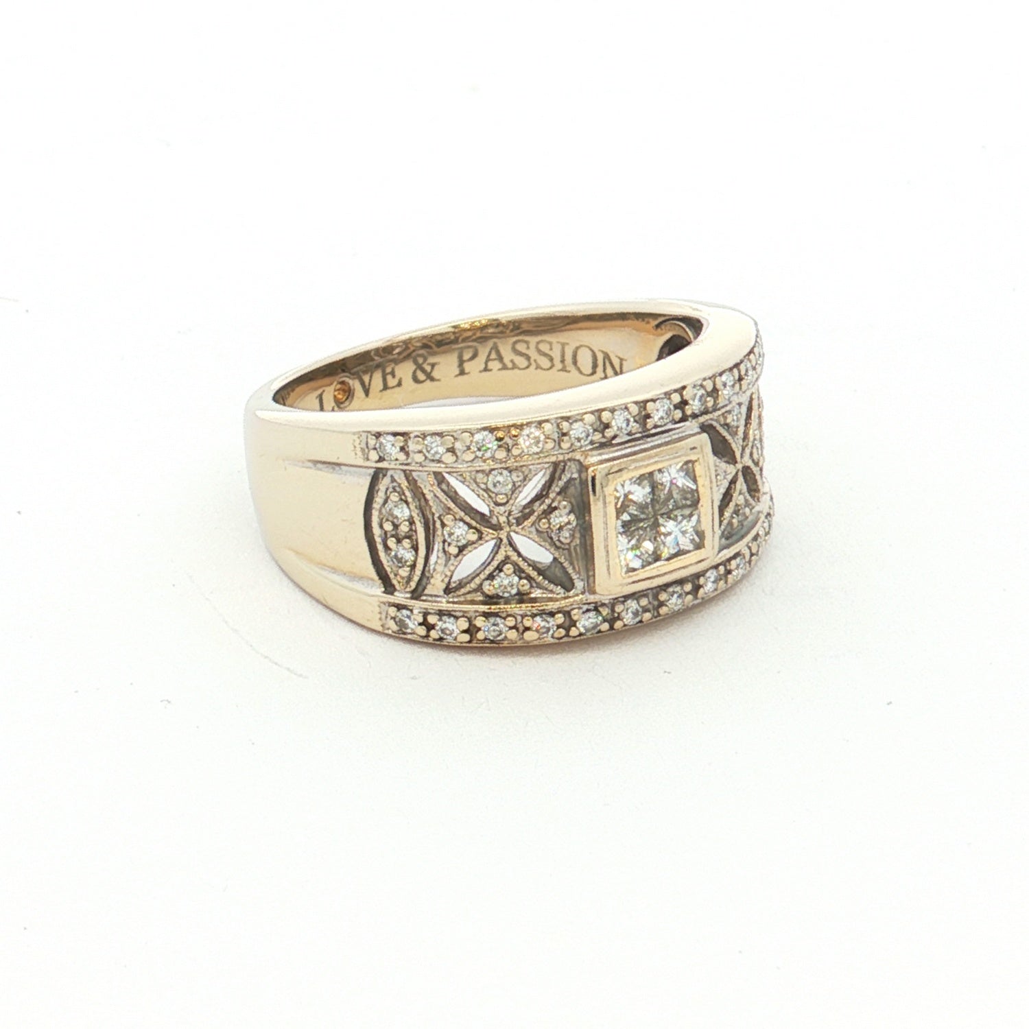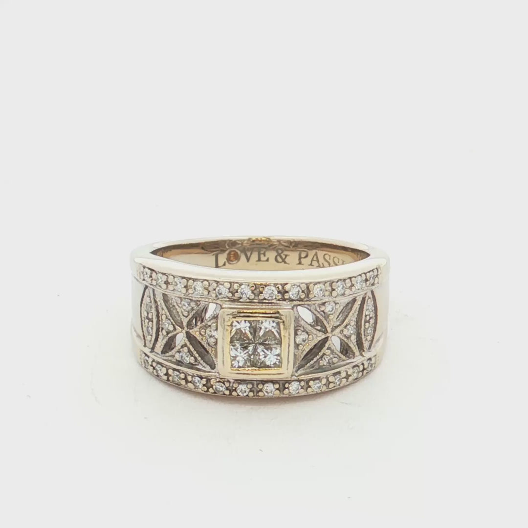A bold 18ct white gold forty-diamond ring featuring invisibly set princess-cut diamonds in a square bezel, accented with bead-set round diamonds in cut-out and outer rows. Stylish and elegant with a wide flared band.
