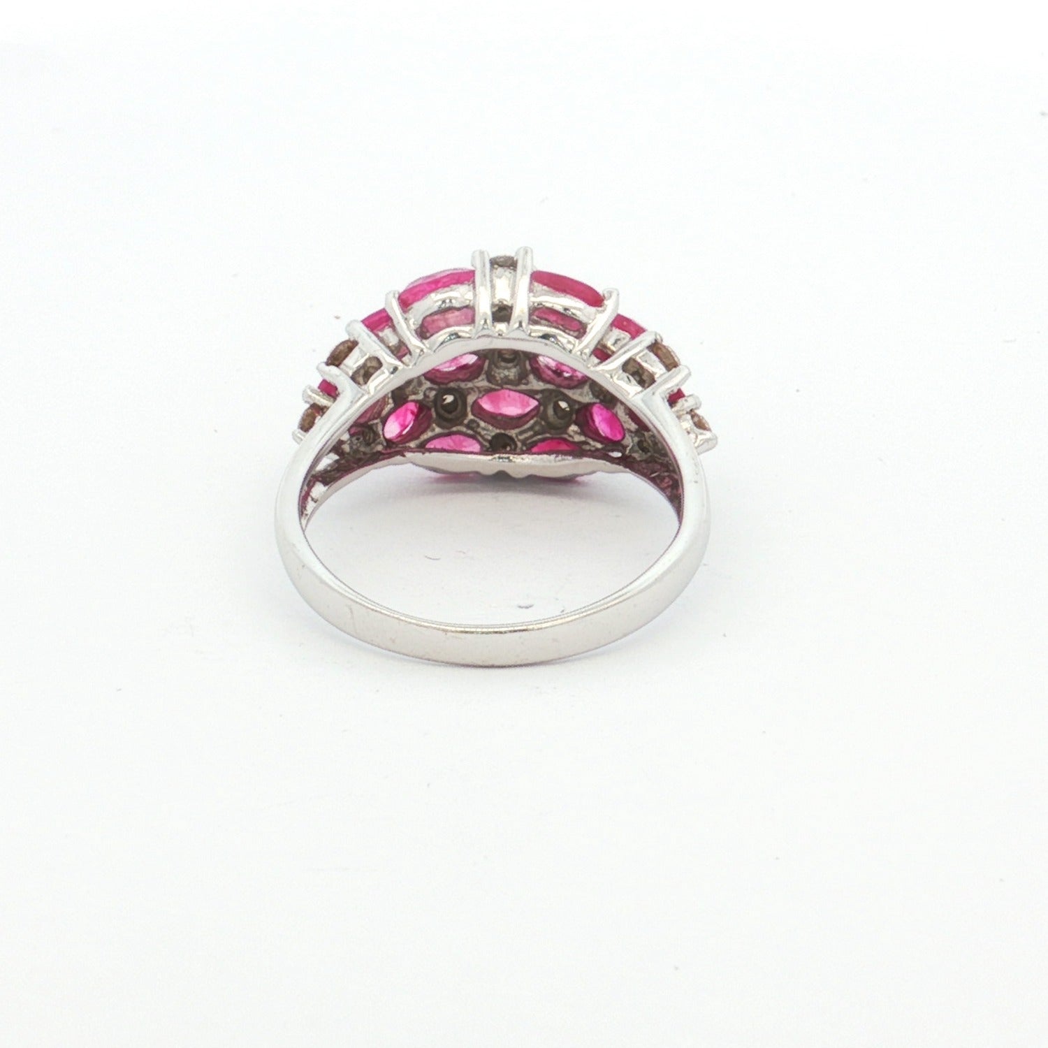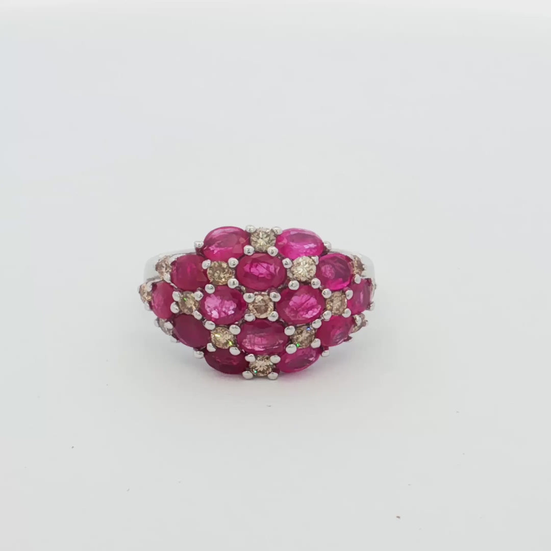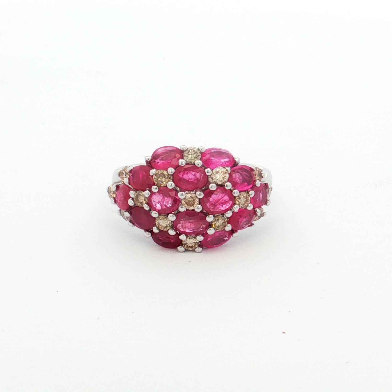 A vibrant 18ct white gold dome ring set with 29 stones, featuring a checkerboard cluster of oval rubies accented by round brilliant-cut diamonds, creating a bold and colourful design.