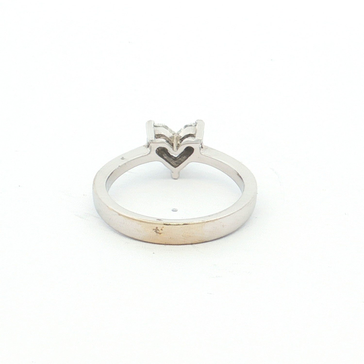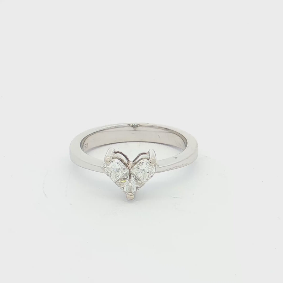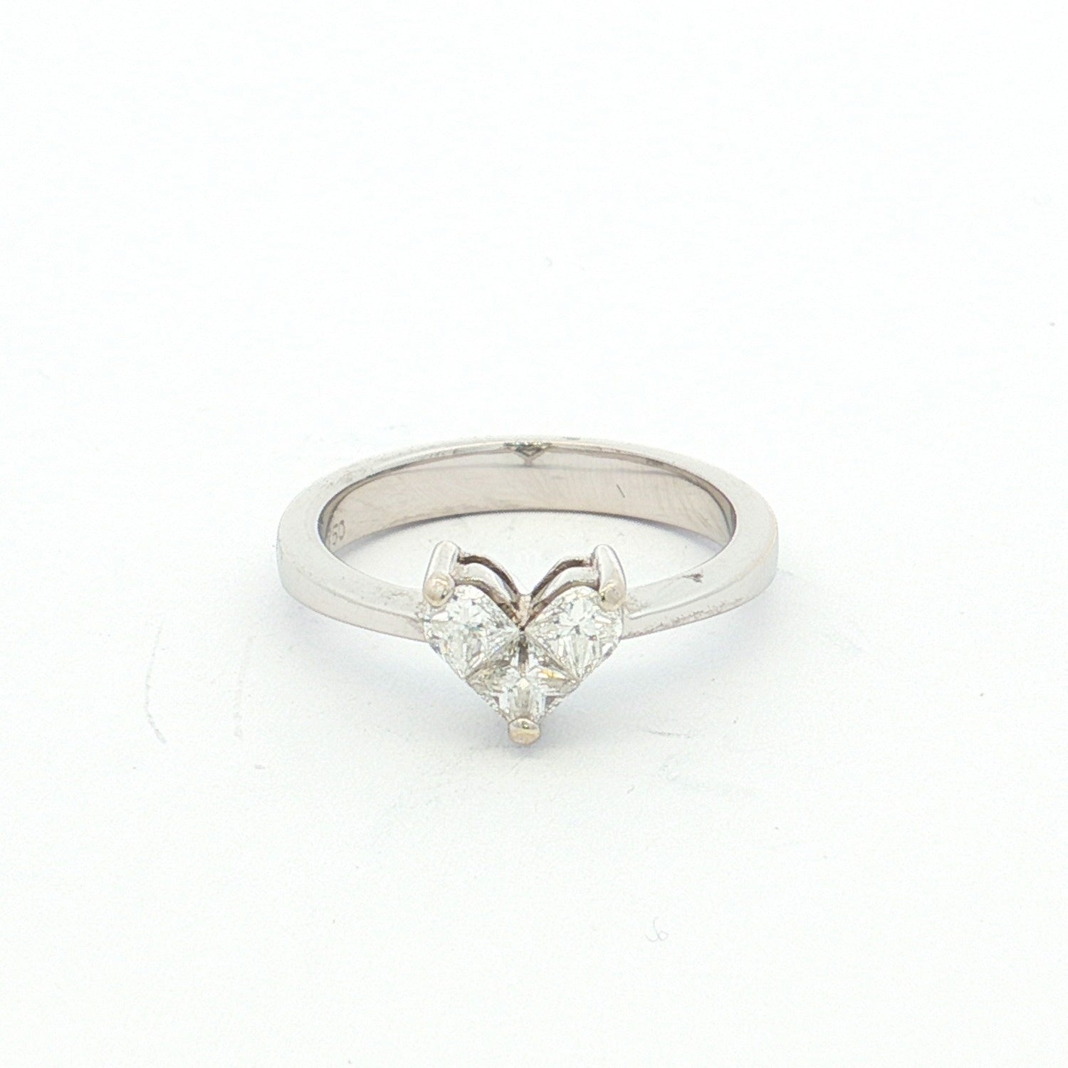 A refined 18ct white gold three-stone ring showcasing a central princess-cut diamond flanked by two specially-shaped diamonds forming a romantic heart motif. The stones are invisibly set on solid tapered shoulders, flowing into a round 3.15 mm band. A timeless design blending classic elegance with symbolic meaning.
