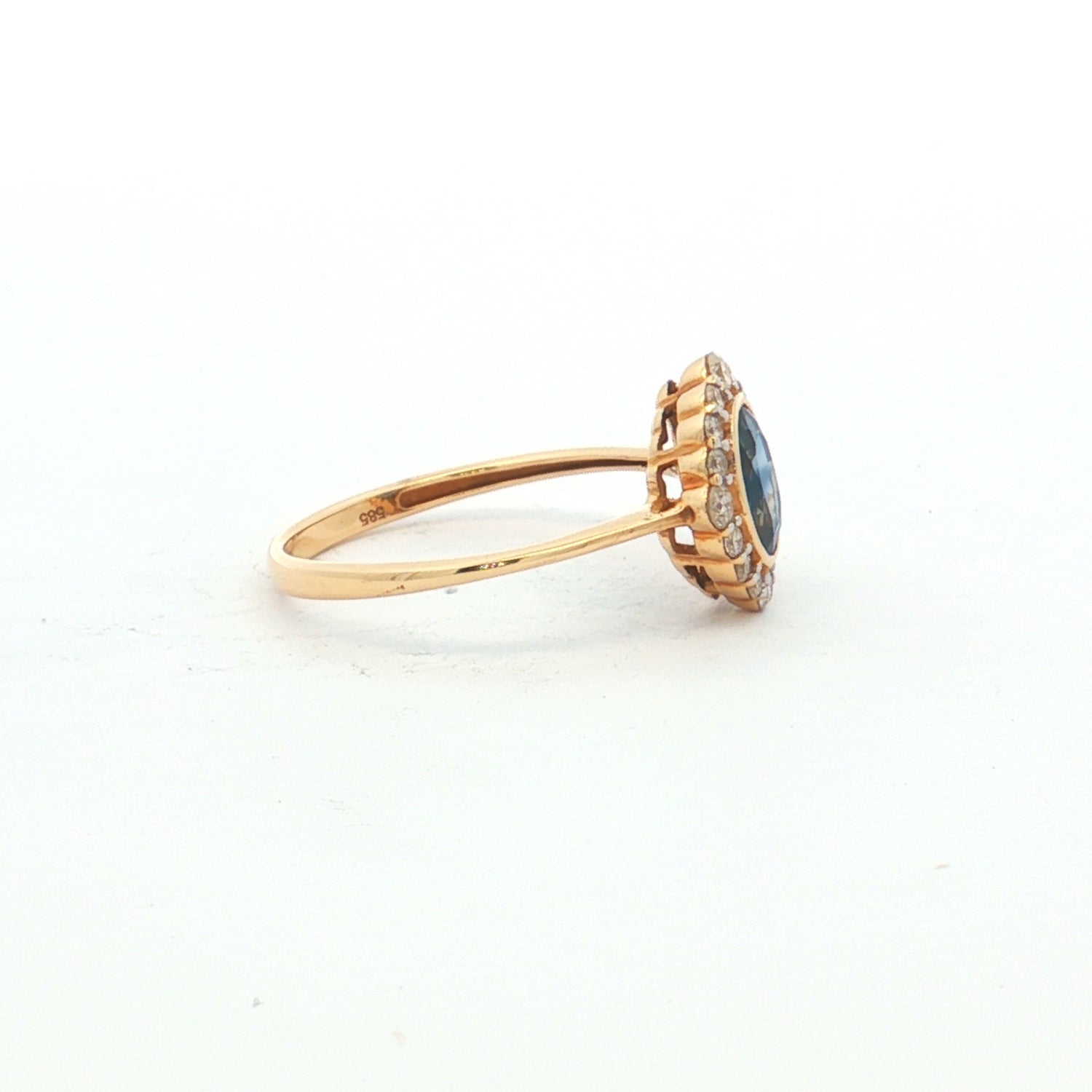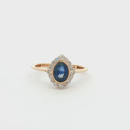 A refined 14ct yellow gold ring featuring an oval-cut blue sapphire bezel set at the centre, framed by sixteen round brilliant-cut diamonds claw set in a single row around the setting. The softly rounded band tapers into a 1.00 mm wide knife-edge profile at the sides, adding elegance and balance to this classic hand-cast design.