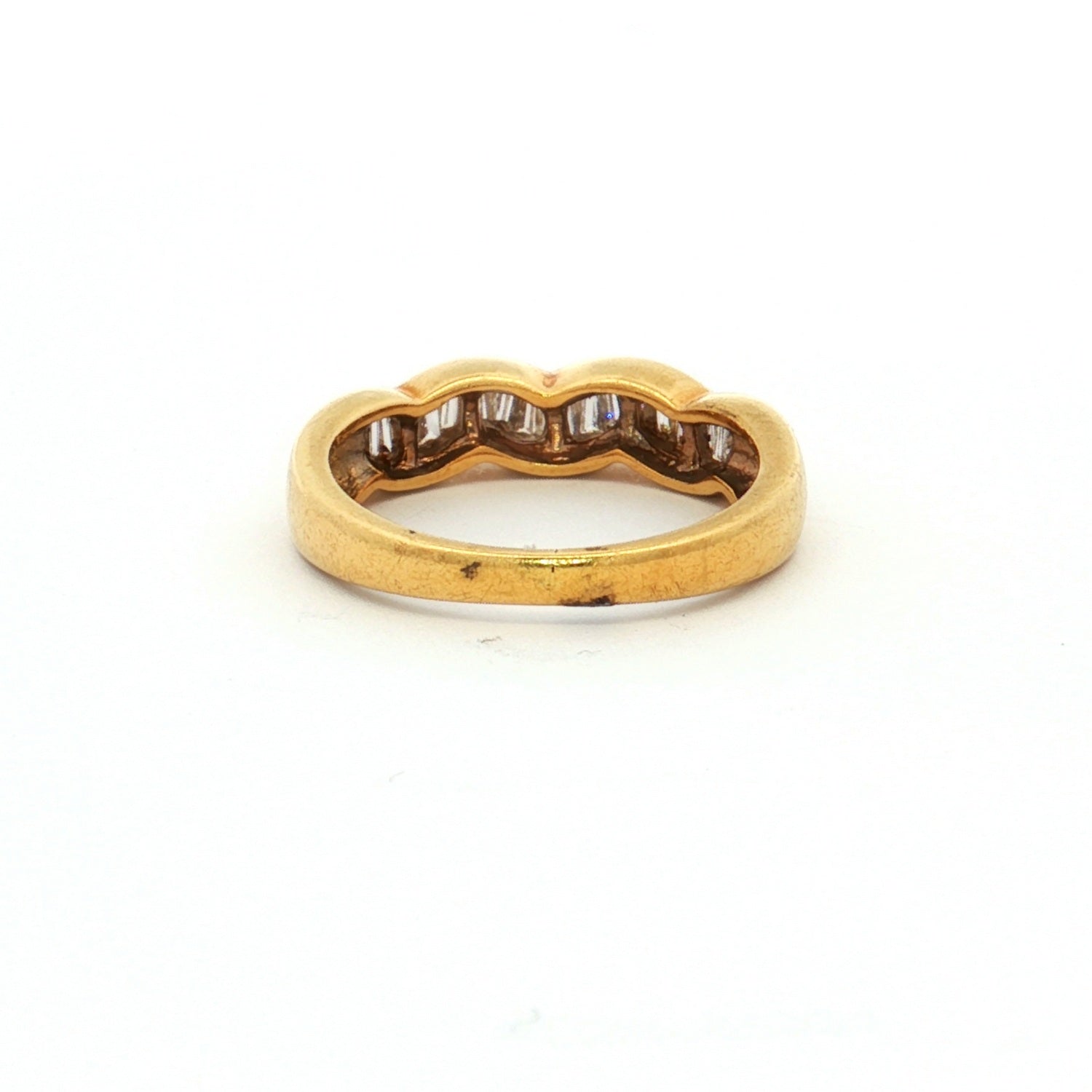 An elegant 18ct yellow gold diamond ring featuring 19 tapered baguette diamonds channel set in a wave-style band, blending timeless sophistication with modern design.