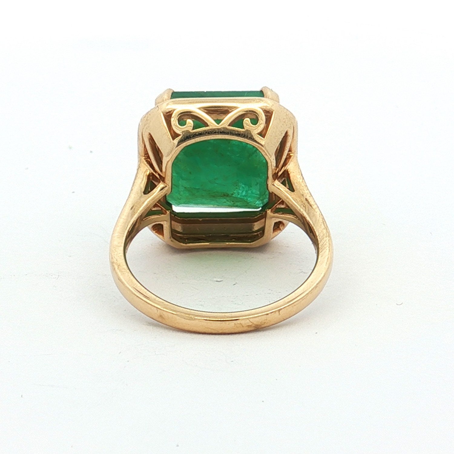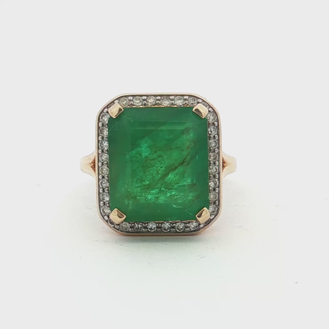 A striking 14ct yellow gold cocktail ring featuring a vivid 10.22 ct emerald claw-set at the centre, framed by thirty-two round brilliant-cut diamonds for an elegant and timeless statement.