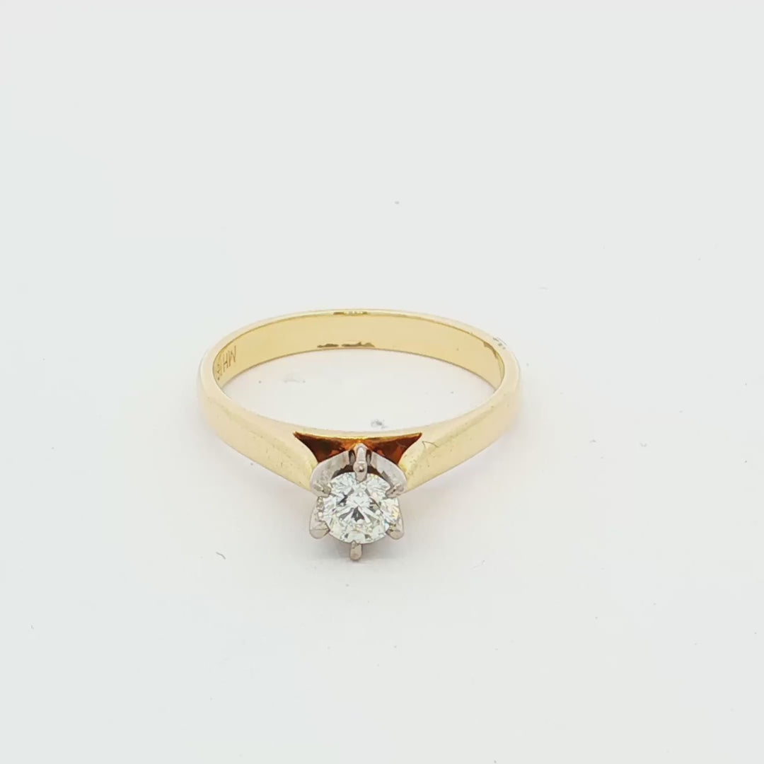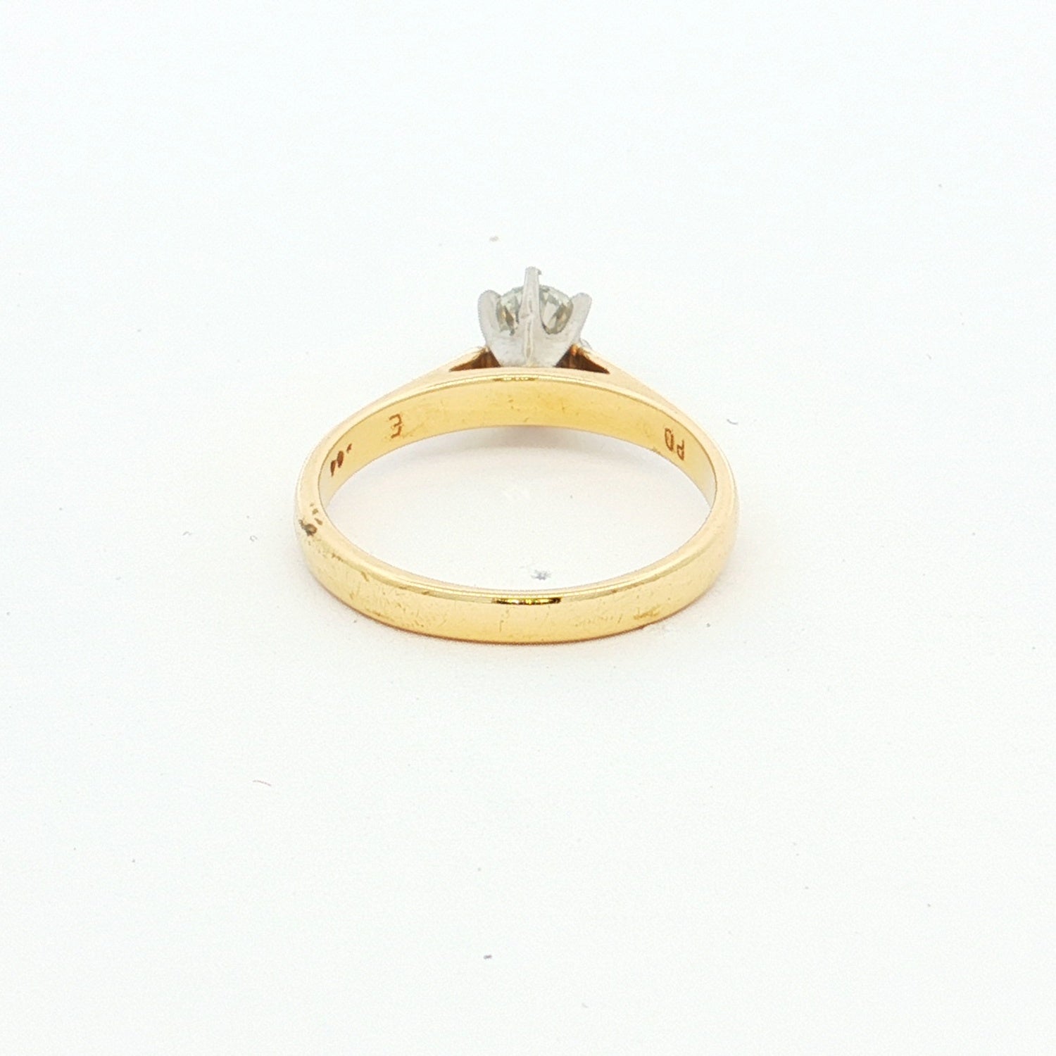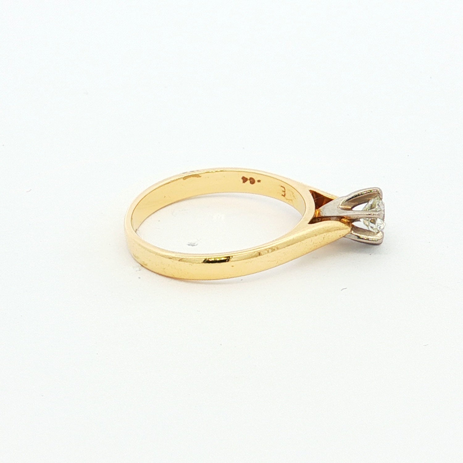 An elegant two-tone 18ct gold solitaire ring featuring a round brilliant-cut diamond claw-set in white gold, with tapered shoulders on a classic half-round band.