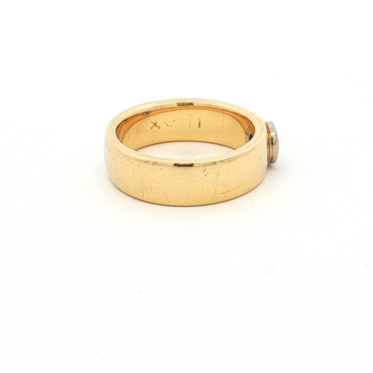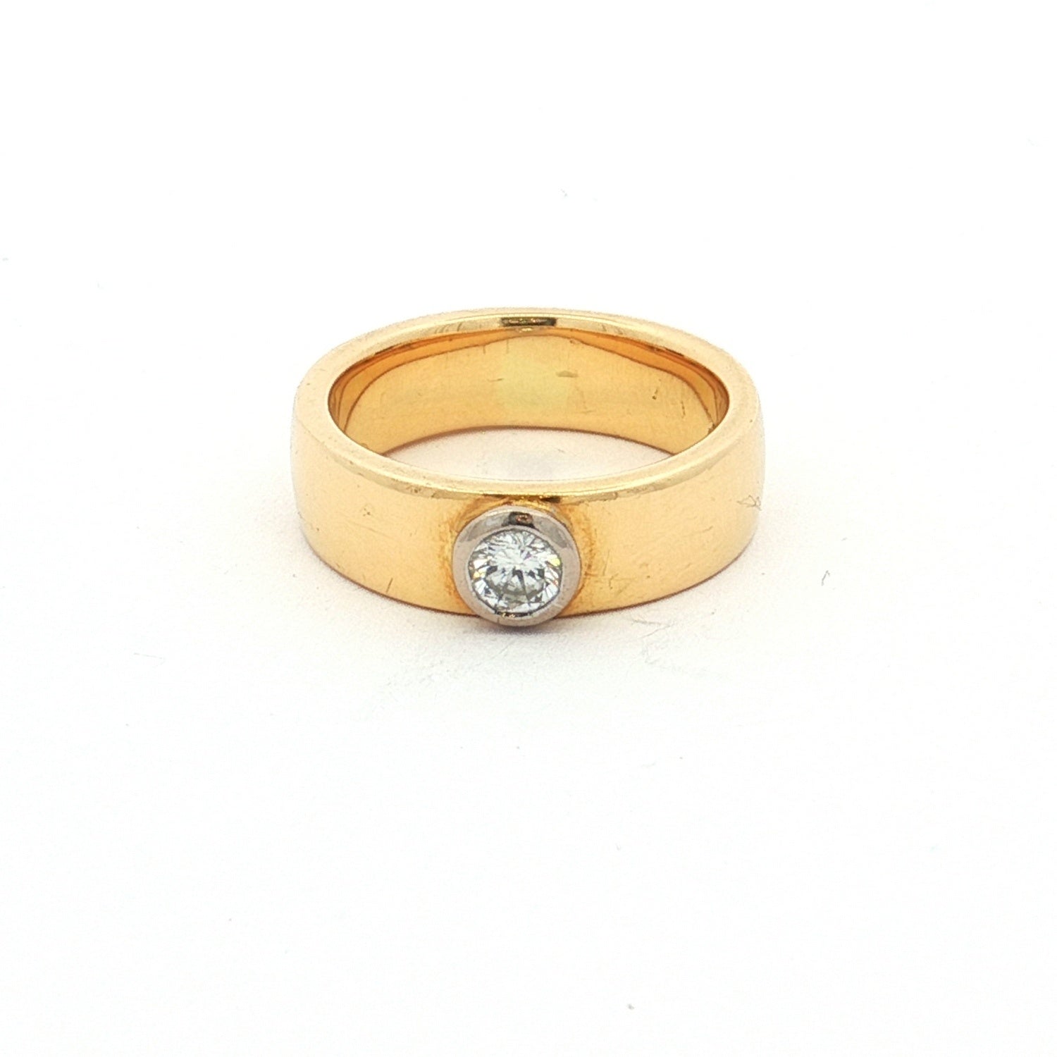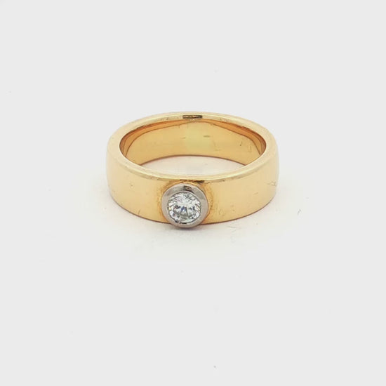A classic 18ct yellow and white gold solitaire ring featuring a round brilliant-cut diamond rub-over set in white gold, mounted on a solid 5.5 mm yellow gold band. A timeless handmade design with a bold presence.